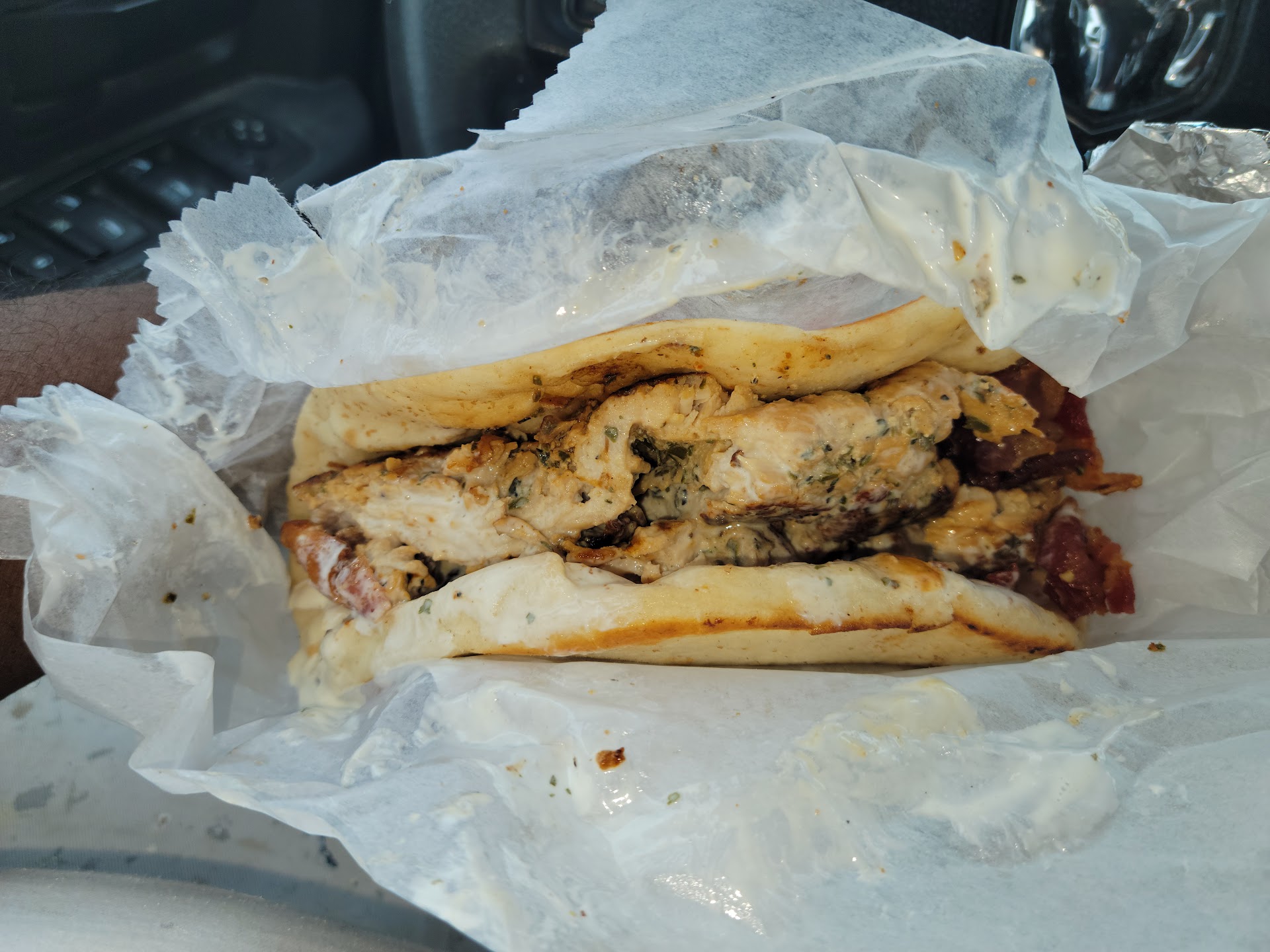The soft and warm pita bread cradles the juicy chicken, alongside crisp lettuce, ripe tomatoes, and flavorful onions – a perfect balance of fresh and vibrant ingredients. The entire ensemble is elevated by a generous drizzle of tangy greek sauce, which adds a creamy and refreshing note, tying all the flavors together in exquisite harmony.
