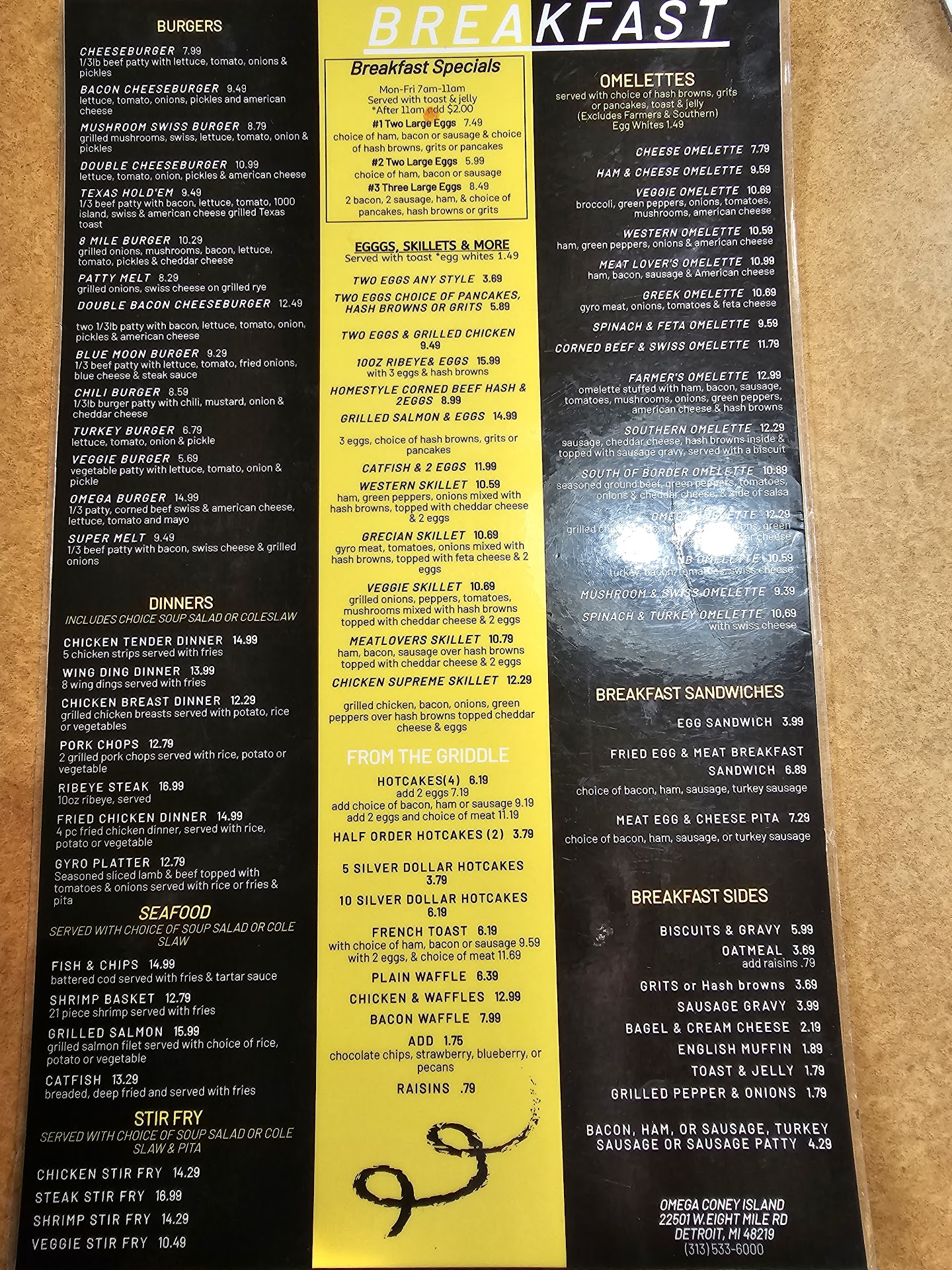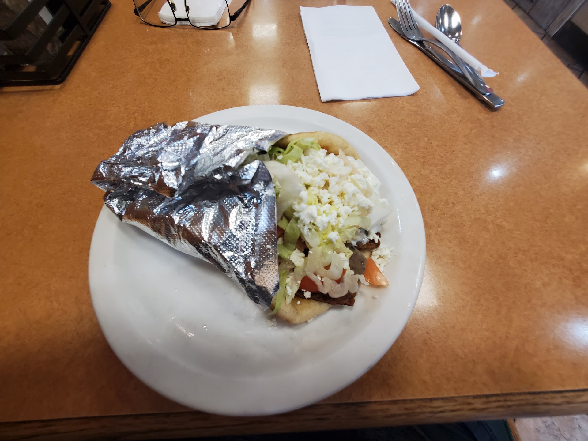 Read moreThis place is busy! 11:30 a.m. on a Tuesday. The parking lot is seriously full (Detroit P.D. in one of them), maybe 6 spaces empty and inside only a couple of small (2 seat) tables/booths plus about 5-6 seats at the counter. I'm calling that a good sign, folks. Despite all those existing customers, I was greeted before I could get to the "Please Wait to be Seated" sign. The menu is fairly large, the breakfast offerings taking up one whole side. So many decisions! There is a small kids menu in one corner but it's mostly smaller portions for the wee ones. Server took my order almost as fast as I could decide, and smiling every time I saw her. Went with a Gyro Supreme ($8.99) and got it about 3 minutes later, hot and delicious. Props to the cooks, too. A well constructed gyro. Often the meat is strewn right down the middle of the pita which becomes the bottom so you only get meat or veg in your bite. This was well offset so I got meat in nearly every...