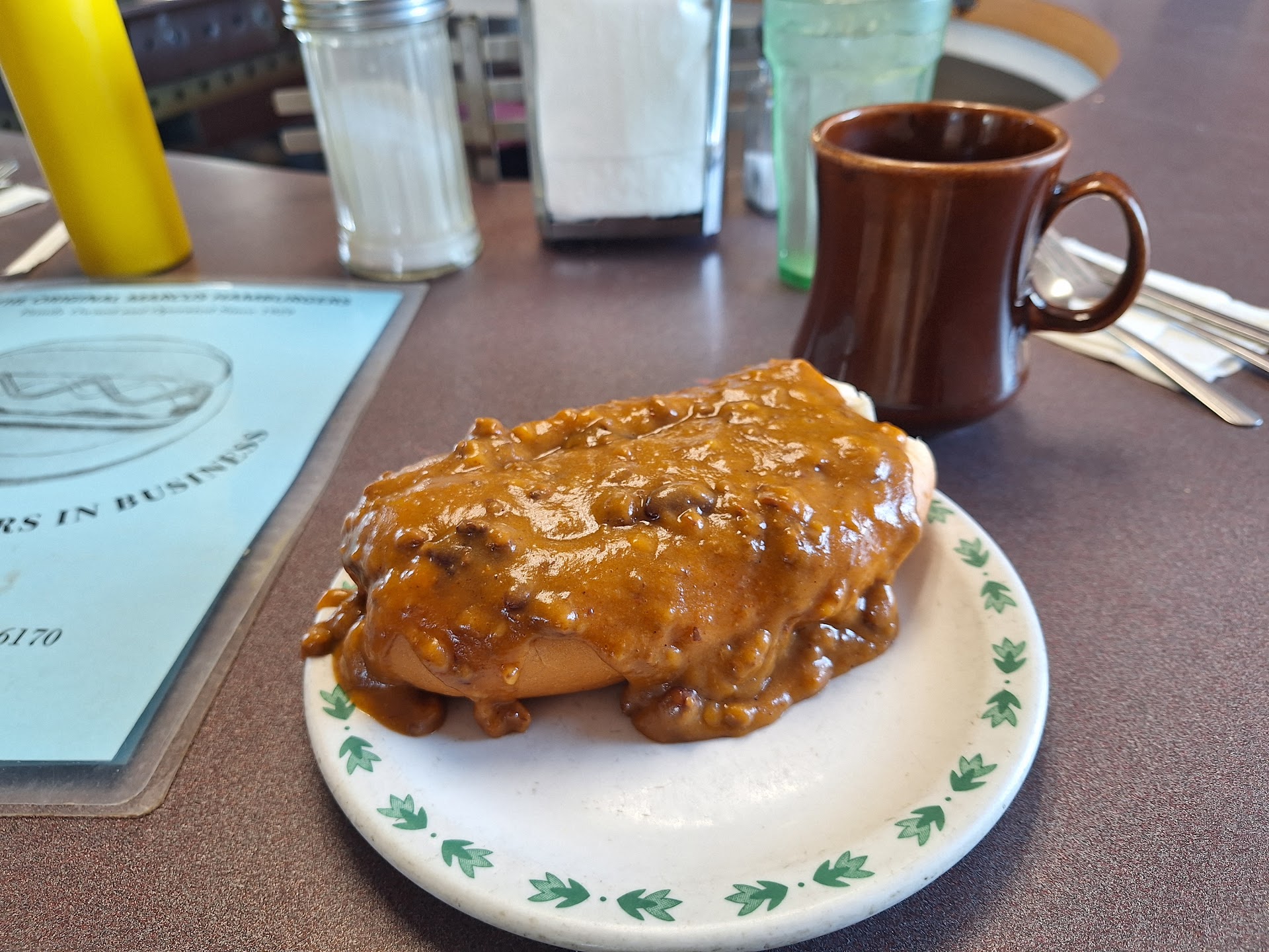 The story goes that when the place opened in 1929 the owner ordered hamburger buns and got hotdog buns instead. The owner got creative and made the burgers rectangular to fit on the hotdog bun. The concept caught on, and 87 years later continues on.