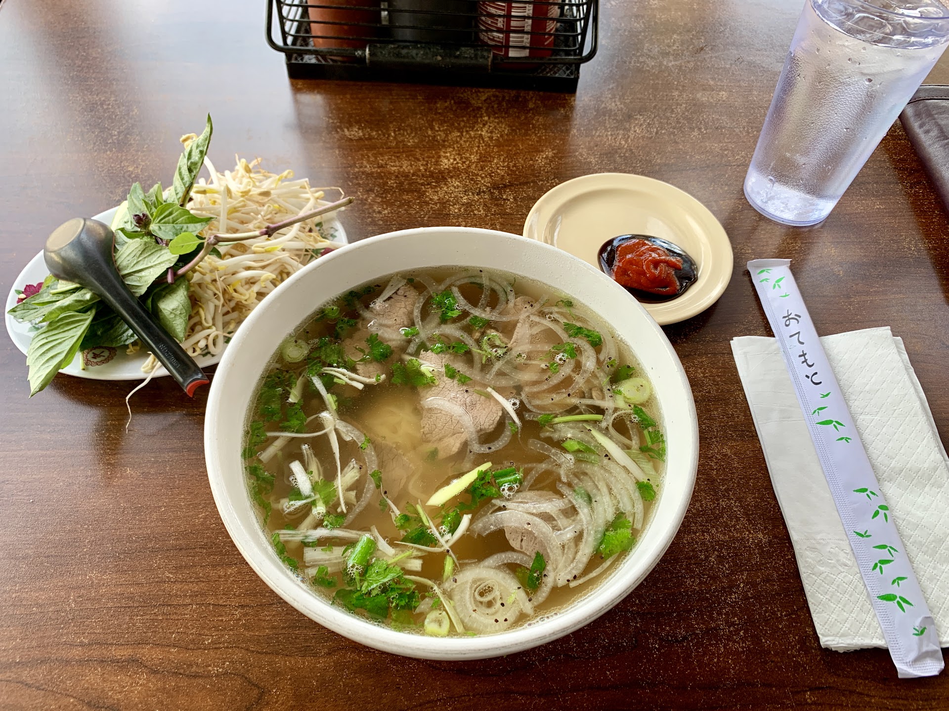 There was also green onions, cilantro, and white onions, and black pepper in the bowl. Again, it was the usual pho accoutrements.