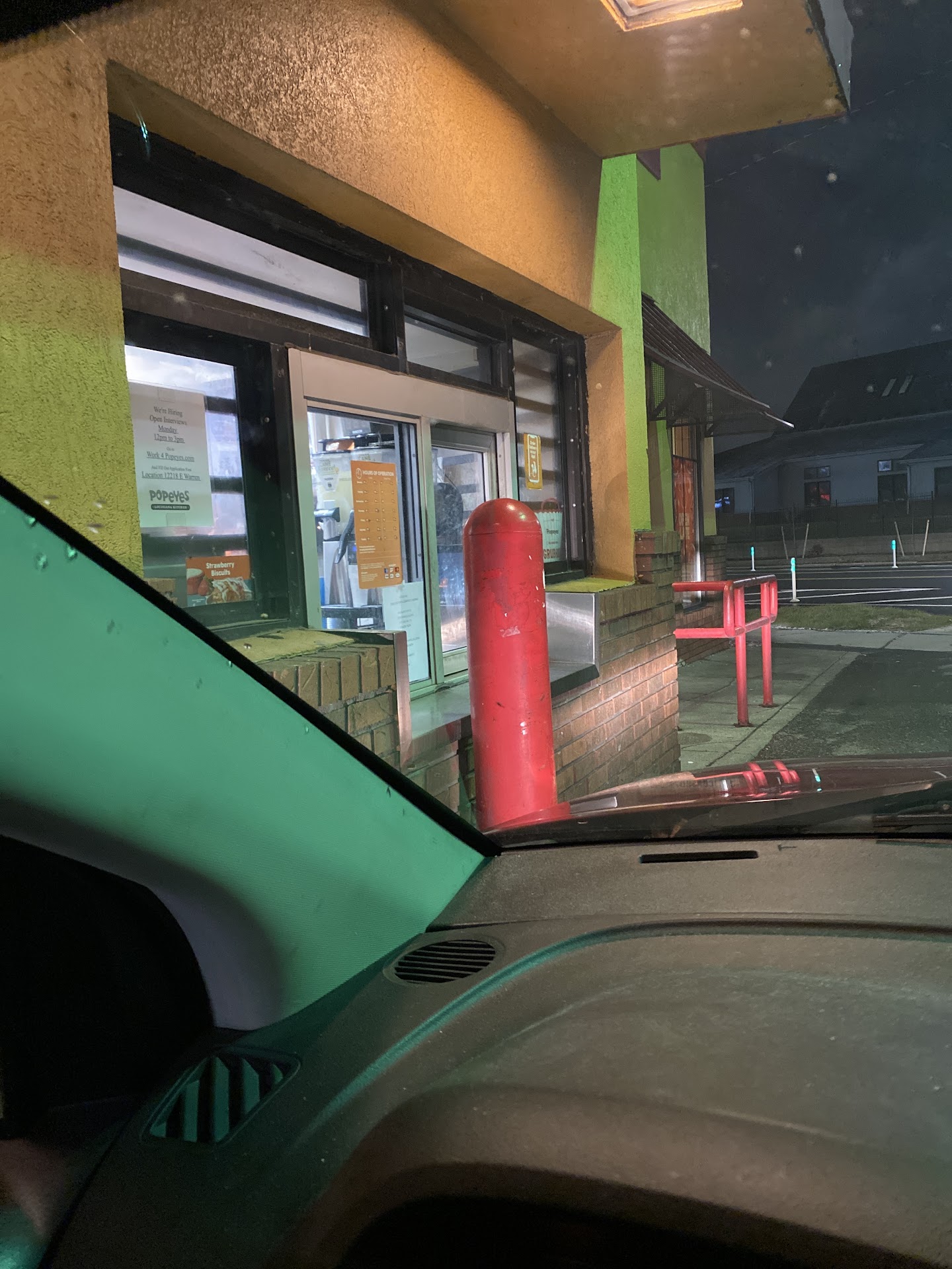 Read moreI recently started working down the street from this location and my first couple of trips there went off without a hitch, but the last 3 times I've tried to get food here there has been nobody answering at the drive thru. Twice it was around 10:30 a little bit after they've opened and I couldn't even tell if anyone had shown up for work yet, and tonight it was 9:15pm and same thing long line and when everyone gets to the intercom no answer from anyone inside. The lights were all on at the display and inside, but nobody apparently wanted to work anymore or something because just no response to any of at least 7-8 cars I saw while I was there. Also, I've noticed a guy standing outside in the parking lot talking to either himself or on the phone for hours on end just about everyday when I drive by, he's wearing the same closes and it walks around and inbetween the cars in the drive though sometimes. Seems harmless, but super weird. Probably won't be going back again after tonight. Guess I'm going to have to get my Popeye fix at the location by my house...