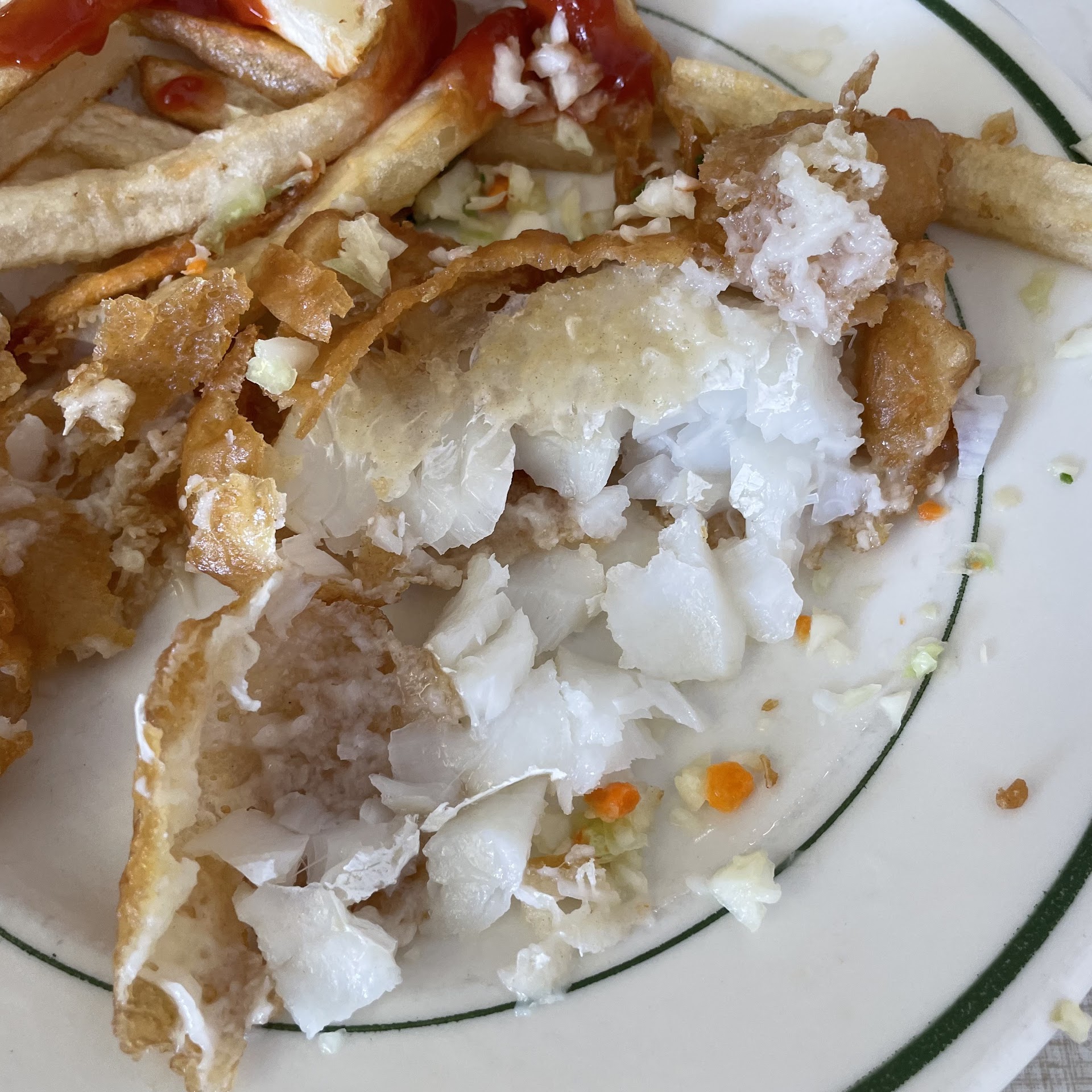 I was going to order carryout and I shared with cashier lady this was my first time in the establishment she suggested I dine to get the entire experience..I washed my hands found a seat waitress in passing says do you want anything besides water to drink I asked for sweet tea didn't have she started calling out drinks I got ginger ale not real was just sugar oh she put a roll and butter on the table then 1minute later almost exactly she brings a fish chip dinner small 1oz tartar sauce and I said that was quick I asked for more tartar sauce waitress tell me it's not free and have I already paid I say I was ordering to go and menu States it comes with large tartar sauce she said that's not for back here we back and forth I said I love tarter sauce that's why I picked it she then says I will bring you some for free this time. My point is I didn't receive the dine in experience I was never given a menu, given any of the waitress time except only in her passing by I had even raised my hand. I watched her bring other customers plenty of tartar sauce and lemon no problem an they were not weekly visters from their conversations just different skin tones. Roll horrible fries/chips burnt horrible coleslaw hideous food had no seasoning at all the cod was fried correct but I didn't even get to tell anyone how I liked my fish or my fries/chips cooked had to ask for lemon I...