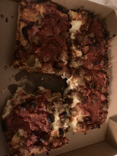 I’m only in Detroit for a couple days, and as a deep dish lover, from another mother state, That makes his own. I was sad I didn’t get a layover in Chicago. Tonight I tried various Chinese places for lo mein. I just didn’t want the 8$ added fees. Some locals recommended shields as well as their decent reviews. And I sat thinking with a belly full of wine, I should try a Detroit style. Well, I called. Talked a bit with the guy. Apparently, our frozen pizzas advertise Detroit style quite differently than these guys make it. Its a pan crust that doesn’t rise. Cheese on the bottom. Healthy servings. And sauce on top. It’s basically deep dish, pan crust pizza. N they make their own sauce. My first bite was fruity of tomato, and a light sweetness. I ordered extra sauce. It’s taken me 8 years to learn to make a red sauce well. So I get excited to try this sort of stuff. I wanted more sauce. But as I bit into the slice. It thickened and became too sweet for me. Which is a result of less spread and less thickening during baking. . The sausage is probably mass produced but is still of rich fennel flavor and heat. There was less pepperoni on the meat lovers. Lots of ham. Charred well, a nice flavor. And the bacon was balanced. So it’s a ham oriented flavor over all. For the meat lovers.