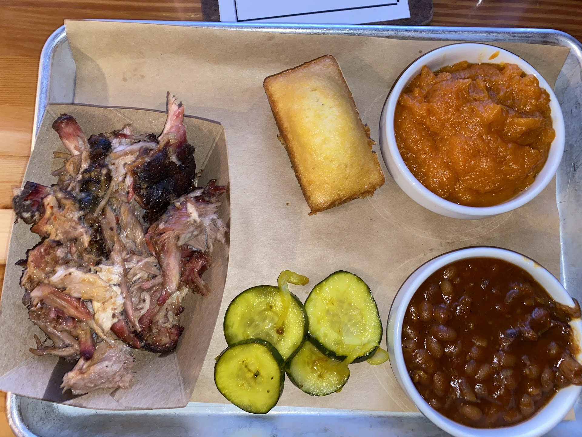 Atmosphere minimalistic, with nicely stained wood panels, vast windows screened to control lighting and set the mood, yet tables so very close together you are definitely going to hear EVERYTHING adjacent tables will be talking about! (so close no two people are going to pass between the tables simultaneously.) Facility clean, from floor to table tops. Impressive was FIVE BBQ sauces, each flavorful marked with permanent impressions on each bottle. "Apple" fantastic 4.75/5, all vinegar-based, each delicious 3-4.75/5 in their own way, (IF YOU DONT LIKE VINEGAR-BASED SAUCES, SKIP THEM!....except the Apple whose sweetness remained pronounced.) Impressive use of REAL NAPKINS which contained silverware....however, some decision-maker's bad judgement had the roll lacking spoons! Pathetic thought, when your menu serves beans, chili, and mash! Corrected after much delay getting the attention of the waiter, who was pleasant, wearing his stocking cap from outside, though provided no suggestive selling until I asked....ouch. Menu thought out detail was the best thing about the place. Food delivery quick, yet visually lack-luster for the ambiance, smoke aroma, and sauce building up of our expectations! Large pans holding a SMALL portion of each item.....SAD when the paper liner shows up at face value MORE THAN the food, nearly signaling cheapness, versus a more robust meal one might anticipate from a BBQ venue. FIRST-IMPRESSIONS are everything, especially in plate size/presentation. Stunned I had to laugh internally, ponder and photograph (see attached), as I wondered how much does cornbread cost versus the damn tiny little loaf presented, which is more perfect for a toddler to hold or a Lil Debbie snack-size portion unwrapped from cellophane in a school-lunch.(Sorry, not sorry Slow's...you can and should do better.) Platter-size to portion off. Quality varied. Per other reviews, skip the mild flavored brisket 2.75/5 and go for the great near excellent 4.5/5 pulled pork, Sweet Potato Mash was excellent in flavor 4.5/5, perhaps too sweet...powerful enough it could be a dessert!! Pit beans tasty great/excellent 4/5 with meat fragments and a rich smoky flavor, of course with a hint of vinegar...remember ask for a spoon! Coleslaw 2.5/5 creamy, yet bland and nearly flavorless. Cornbread 4.5/5 surprisingly tiny of a tease, yet moist. While we admittedly DID NOT have ribs, due to noticing neighboring table having quite a bit more pull on them! Completed Rewards Registration noted at bottom of receipt, and inquired of waiter how it all works, who was perplexed and could not answer basic questions. Asked for managerial assistance, to which he indicated HE WAS MANAGEMENT with lack of knowledge as to the program mechanics, indicating rarely used. Overall, OK to GOOD visit, with much room for improvement. With the greatest of humor, exited at 5:30pm with a full-smile "thank you" to the still seated hostess, chuckling as I shared she "still had another hour before that 6:30pm reservation...