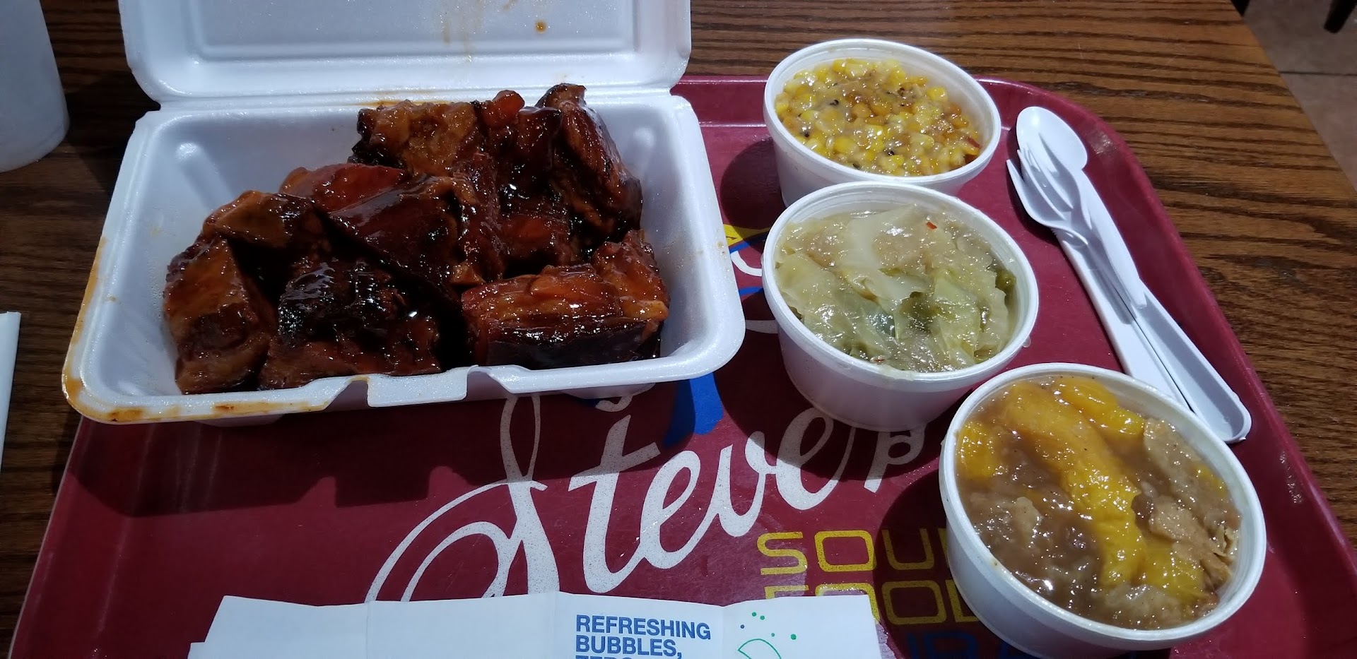 At this restaurant, the food is served up cafeteria style. You walk the line and a helpful employee tells you what is available on the line and describes dishes if you are not familiar with them. After listening to the menu choices I had BBQ chicken, collard greens and pinto beans. My wife had the rib tips, cabbage and corn. To be honest, I have never had that much food in a restaurant. And, to say that this was soul food would be a gross understatement. This was the absolute best soul food I've ever had. And, as I told Steve the owner, who happened to be there, those collard greens were second only to those of my Mother (rest her soul). That is the highest compliment I can give to any cook. The food was that good. The chicken was falling off the bone and was an entire half chicken. The beans were done just right and were also delicious. My wife ate just about everything on here plate too. We were both happy, to say the least. And despite all this food, we also had desert. I had the sweet potato pie and my wife had peach cobbler. Needless to say, we had to take the deserts back to our hotel for enjoyment at a later time. We were too stuffed to eat them.