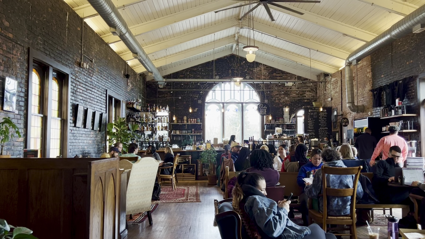 The soaring barrel-vaulted ceiling, painted white with exposed beams, creates cathedral acoustics that amplify genuine community conversations. Original maple floors gleam under Edison bulbs, while weathered brick walls showcase local art. The most striking intervention is the Nordin Brothers' stainless steel window installation—a modernist interpretation that honors the building's spiritual heritage while announcing its secular transformation.