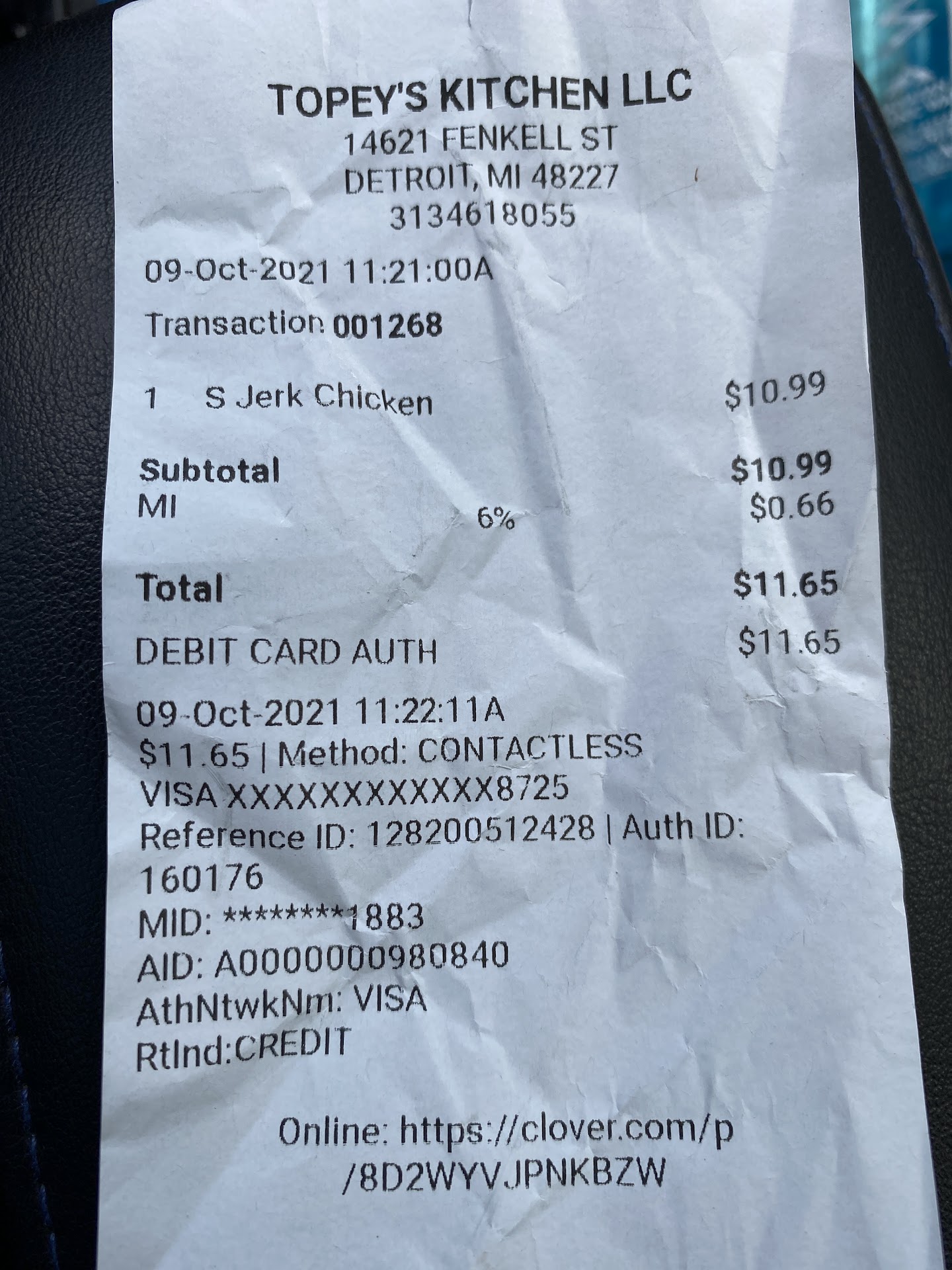 Read moreThis is my first time at this New Caribbean Restaurant (Topey’s Kitchen)on Fenkell Ave Detroit, I ordered the Jerky Chicken with Red Beans and Rice With Cabbage! I was very excited to try this new restaurant. This restaurant is awful. The chicken taste like Grease and Very Weird Taste,No Cabbage, they replace cabbage with just Bell peppers and onions!!!!!! By the way the Bell peppers is Undercooked and hard.That’s not Cabbage! I would never eat here again or recommend any of my friends or family to eat here. Don’t lose your money and be so disappointed. I returned to the location with the food and spoke with the owner who just argued with me. The owner just continuously tell me we don’t use Grease with our chicken!!! FYI “ i’m a 26 year old African-American male living in the city of Detroit.I think I know if my chicken tastes very very weird and greasy which it do. Don’t taste Nothing like any of the Great Caribbean restaurant like the Caribbean Kitchen on W. McNichols/6 mile. I wish I could’ve checked this restaurant reviews before I ordered and wasted my money but you win some you lose some but this one is...