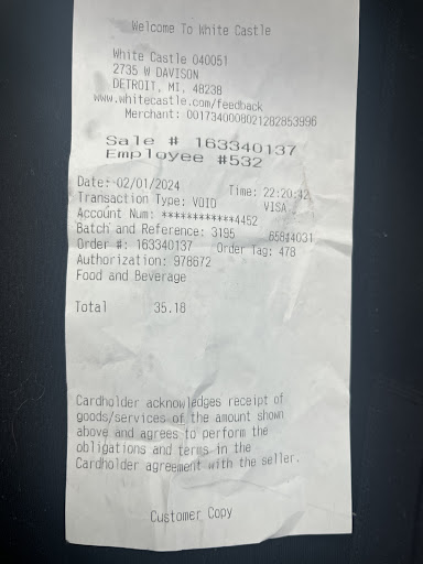 This was the most Horrible experience at this White Castle on the evening of 010224! The employee over charged me for the wrong order for 35 dollars and still wanted to make me pay for my food as well, they threw my food away because I refused to pay an additional 21 dollars with no offer of compensation no discount no coupons, the manager was rude and nasty unprofessional n slammed the window in my face, I had to make a police report and go home with no food n 35 dollars lost from my account, all they did was dismissed my problem n offered me to come back n get2 complimentary cheese burgers, forget them no those cheese burgers, I’ve will be sure to tell all my employees at the city of Detroit, never again! We need better respect for each...