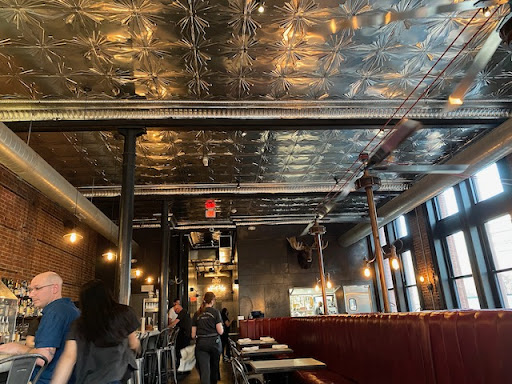 The 2nd floor opens to a long marble bar, Edison light bulbs, and an expansive oil painting. The bicycle chain fans and the metal ceiling with leather couches created a great vibe for dinner and provided a great view of downtown Detroit.
