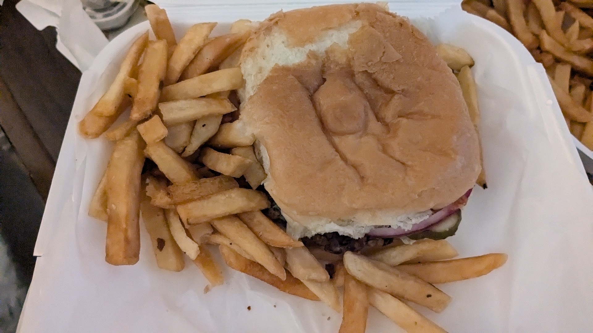 Read moreA downtown DeWitt delight! Ample parking either in the street (I believe no meters) or behind the restaurant (Though be careful to not usurp party store parking space. God help you if you do! LOL). Spacious inside. I got a bar-vibe and sure enough tucked away in the corner there is a small beer/alcohol station. Our wait staff was a hustler. She took beverage orders as we were taking our seats. She was on top of the specials and throughout lunch visited the table just enough times to make sure our diner needs were met. The menu is great! Breakfast until 3. A nice build-your-burger section. I chose the falafel which comes with fries. They were out of sweet potato fries (boo!). The falafel itself was pretty good but it was made with a tortilla (instead of pita bread) and served as a wrap, no onions and spring greens mix (which...I kinda liked though hardly traditional). I don't think it had tahini sauce. So was it a falafel or a fauxlafel (see what I did there?)? I did eat every bite though. An enjoyable visit to a pleasant restaurant in a peaceful town. DeWitt is a hidden gem. One of those stroll-worthy mid-Michigan small towns people...