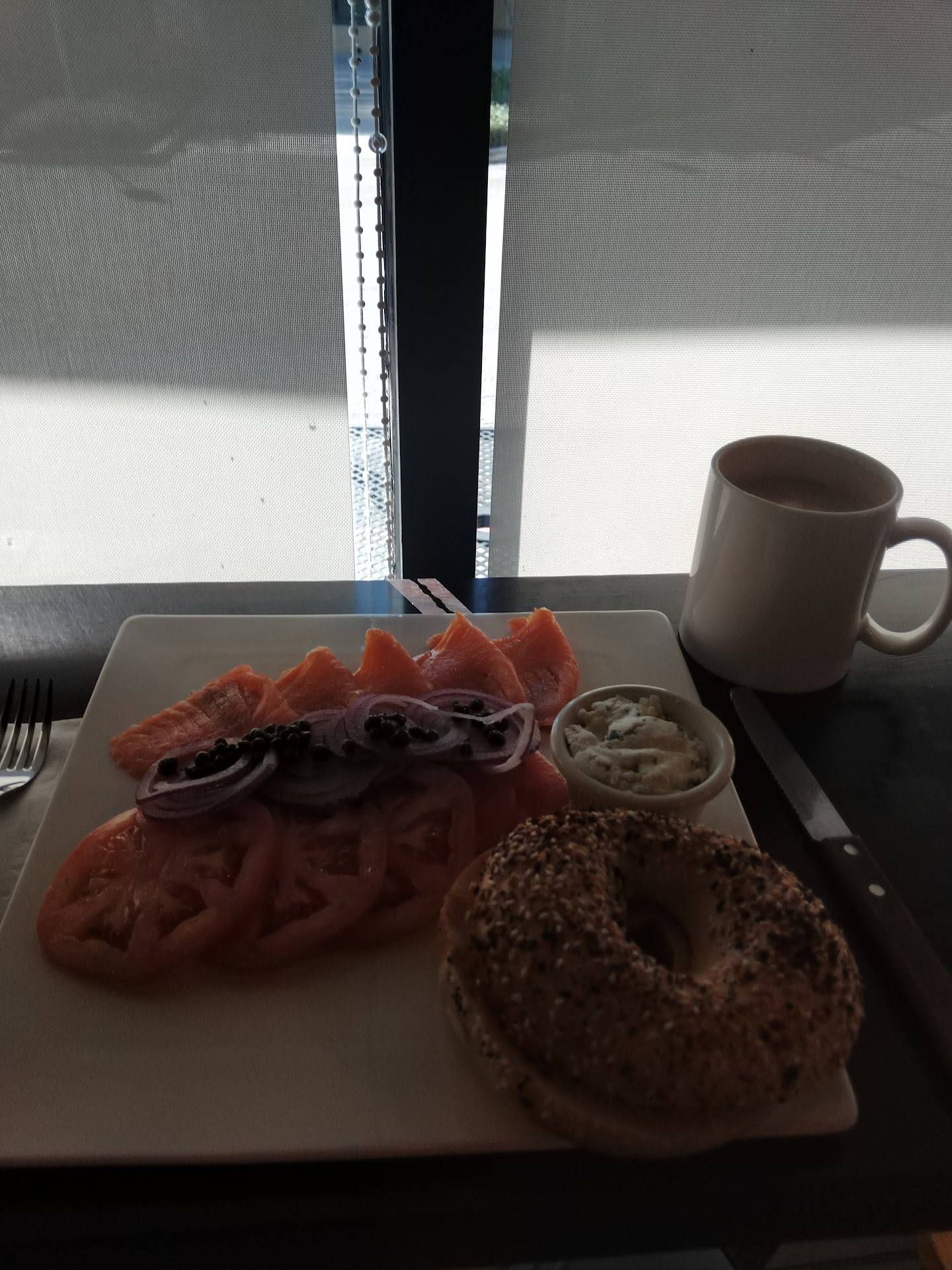 We spent $70+tips at this location for three bottom-of-the-line bagels and three coffees on a Saturday morning. The bagels were stale and bitter, the eggs had an extremely rancid smell, the avocado slices were paper thin, and the tomatoes had that dirt flavor. The drinks were very bland and lacked flavor (lavender latte, chai spice) and tasted like a quick at-home pour-over. A huge Saturday morning disappointment for $70!! We kept thinking of all the better restaurants we could have enjoyed instead. We also considered how many cartons of fresh eggs and freshly made bagels we could have purchased and made with top-of-the-line ingredients for such an atrocious cost. One of our groupmates literally needed to vomit after. Unfortunately, the drinks went straight to the trash, and half the bagels too. It is shocking how this place is open and how on EARTH it is ranked four stars. It still stings when we recall how terrible this experience was. Nothing justifies 3 low-quality bagels and terribly made drinks for $70 bucks. A pair of girls at the table behind us had similar frozen experiences and I could tell they were also hesitating to ask for a refund. PLEASE save yourself the money and disappointment and go somewhere else. Biggest rip-off in 30 years of SoCal dining experience. Also, the bathroom reeks of a fishy...