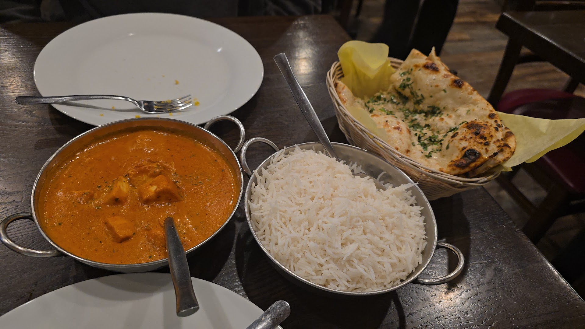 I arrived about 7:45pm on a Sunday. The place was small but cozy with a good atmosphere. It's also pretty popular as there was a wait and quite a few to-go orders. I placed my order, spicy lamb vindaloo and palak paneer, my staples whenever I try a new place. Because the place was so busy I told them I would wait outside on the bench by the door and asked them to bring me my order when it was ready. I waited about 20-30 minutes before going back inside to check on my order to find that it was already done and sitting there for who know how long. That was disappointing. I know they're busy but I was literally two steps away from the hostess stand.