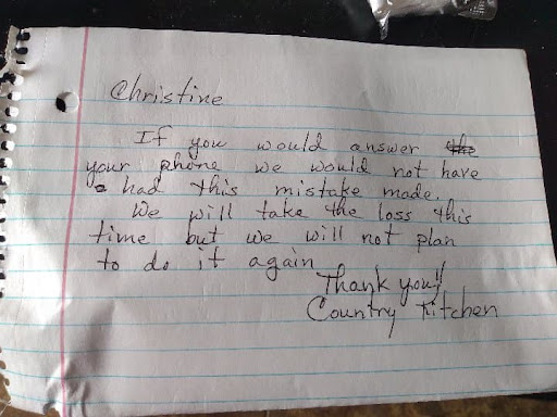 Read moreI normally have a good experience with Country Kitchen. Today when my order was 20 minutes late, I called to ask what happened. Country Kitchen didn't have the address correct, and they left the order on someone else's doorstep. They claimed staff members called me, but I have no missed calls or voicemails. They agreed to redeliver my order. The delivery driver called and didn't know where I lived. She was once again at the wrong address!
