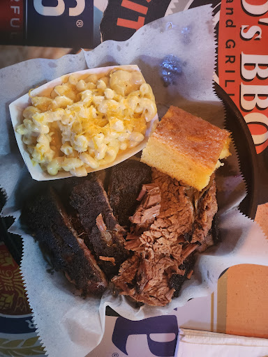 If you NEVER eat bbq you might like this place. If you cook ribs, burgers, and brisket at home, you'll hate it. We ordered the brisket sandwich, brisket plate, buffalo chicken sandwich, and pulled pork sandwich. Corn bread was good, not great but not bad. Fries and onion rings were great. Gluten free bun was delicious. Pulled pork was dry as sawdust. Even soaked with bbq sauce and salt it was tough to eat. Brisket was very dry. Seemed more like a bad roast than brisket. The burnt ends were hard, crunchy and inedible. Which is disappointing, the ends are usually the best part. Smoke flavor is there but when drowned in sauce it completely disappears. If the meat was seasoned at all we could not taste it. The chicken sandwich was sent back. It tasted like high school cafeteria food to me. My son who ordered it thought it tasted like it came from the Costco freezer section. Garlic mashed potatoes were dry and not very garlicky. Edible but not great. For $16 a plate we felt swindled. Great atmosphere, Brooke O. was our server she was awesome but the food was a complete let down. It must survive from drunk college kids who thrive on the ambience and disregard the poor food. If you want good bbq you need to...