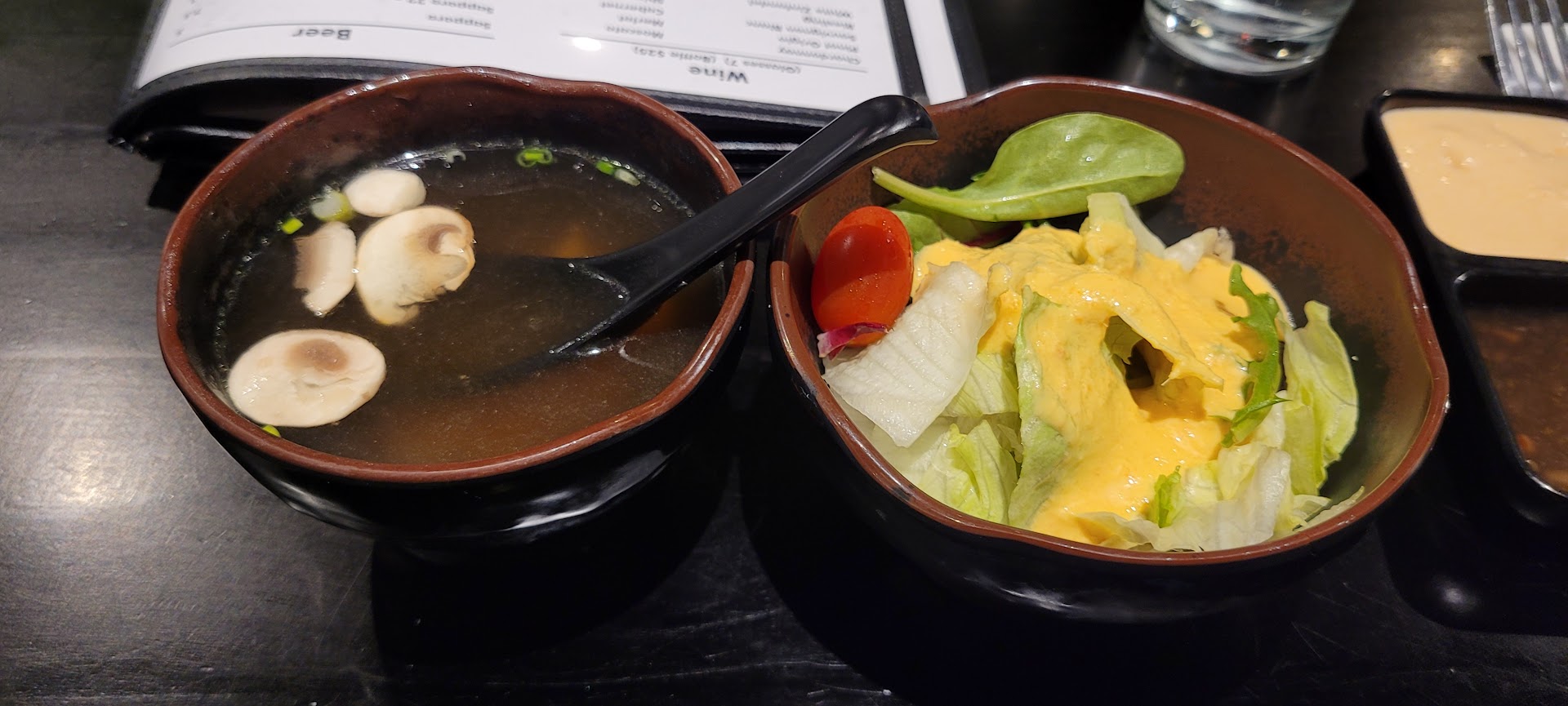 The mushroom soup starter was okay. The broth tasted like it was bullion cubes rather than broth. They also use fried onion straws which I don't care for.