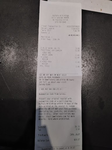 Read moreCame in pretty late on Friday the 24th as our event hadn't ended until late into the night. My 2 friends and I had split the bill but apparently she expected large tips from ALL of us, because I know for a fact I left my receipt to my meal blank and only signed my name after asking my friend clearly if he had already left her a tip. Apparently that wasn't enough. It's ok, I already know what happened. Angry woman saw a blank slip, probably forgot it was part of a shared table, and upcharged for a tip to "teach the customer a lesson." Well, I was born and raised in the Dickson area. I moved to Clarksville for the past few years but trust me when I say I would come into that Buffalo Wild Wings and make sure yall would get taken care of. I recognized MANY employees in there including the very server that ripped tip money from my card. What if not everyone at a table has the money to tip (which is the case, and why I'm writing this review), a $5-10 tip from ONE of the people at the table is the same as receiving a $5 or $10 tip after seating a family or other party. So why forcibly take more. Honestly, I already knew calling up about this issue would result in unprofessional behavior and a "oh well sir do you want to come in and PROVE that you didn't write a tip in your receipt?", so I'm not even going to waste my time seriously. Just know you lost an extremely valuable...