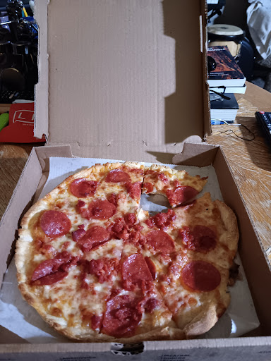 I got a Chicken Alfredo pizza, It’s hard to find pizza places around here that you can get Alfredo sauce instead of tomato sauce, so I was excited to see it on the menu, I was quickly disappointed upon arrival. My pizza basically arrived raw, the Dough was literally white and it tasted like pure raw garlic. Apparently they also decided I needed to cuddle with my father during dinner, because our two sides of fries were very rudely shoved into one container.