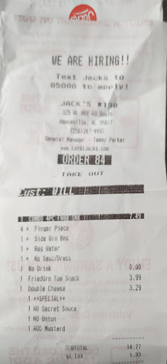 Read moreThis was the absolute pit of hell as far a fast door comes. We are from Huntsville- driving home from knee surgery. All I wanted was an Oreo shake from Jacks. There was ONE person in from of us in the drive thru and no one else behind us. Woman told us to hold a moment- took forever. We order and they “aren’t going doing shake right now because there’s only two of us”. So we order meals. Absolutely nothing on burgers not even the extra pickles I asked for. Woman told us that she decided they aren’t doing shake because of the wait time even tho WE WERE THE ONLY ONES THERE!! In the amount of time she was coming up wi the excuses she could have corrected our order and make about a dozen shakes. Barely any liquid in our drinks- all ice. Decide we’re going to use the restroom (again knee surgery, on crutches, from out of town) when we get to the door it’s locked. No signs or anything. So thankful this isn’t our normal Jacks. What a gross and...