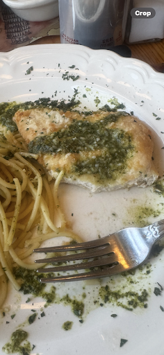 Our food arrives both served in cold dishes. My raviolis tasted like frozen raviolis with some very bland sauce and a crap ton of Parmesan cheese you know like the one out of the container. My husband’s dish came out a very thin flat piece of chicken that tasted like it had been boiled and then dipped in some sort of batter and then quickly seared on both sides, covered with pesto sauce. It was so bad. My husband could not eat it because some of the batter was mushy.