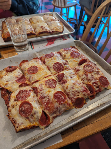 GOOD FOOD ... I got the pepperoni Detroit style pizza which I thought was really good and was huge! You could easily split that between four people, there were eight large slices. I ate two pieces and was pretty full, it's thick pizza. They serve bread as you are seated, which they don't make fresh in house, but was really good. I got water with my meal and it was just over $21 with tax. I took 3/4 home. Good deal on the pizza!