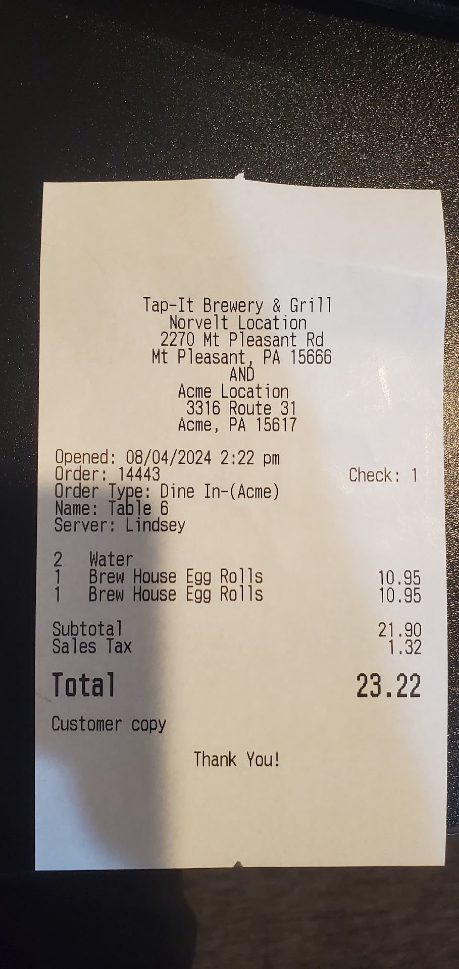 I also had a glass of water. And washed down my water with a other bite of rueben egg roll.