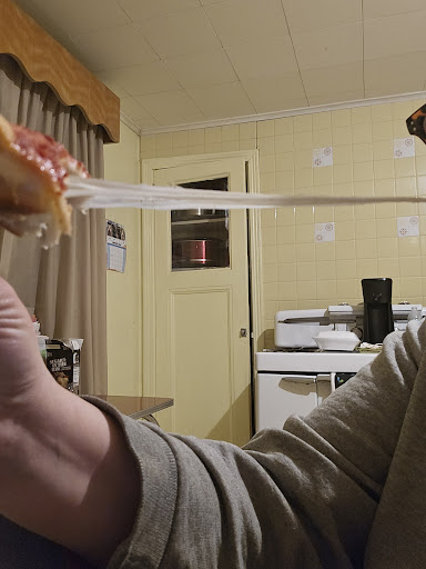 Followed his recommendation of heating the leftover pizza (which there was a TON of, because it's SO FILLING!) in the air-fryer (350° - 8 min) was just as good. -heck, even a cold slice was great too.