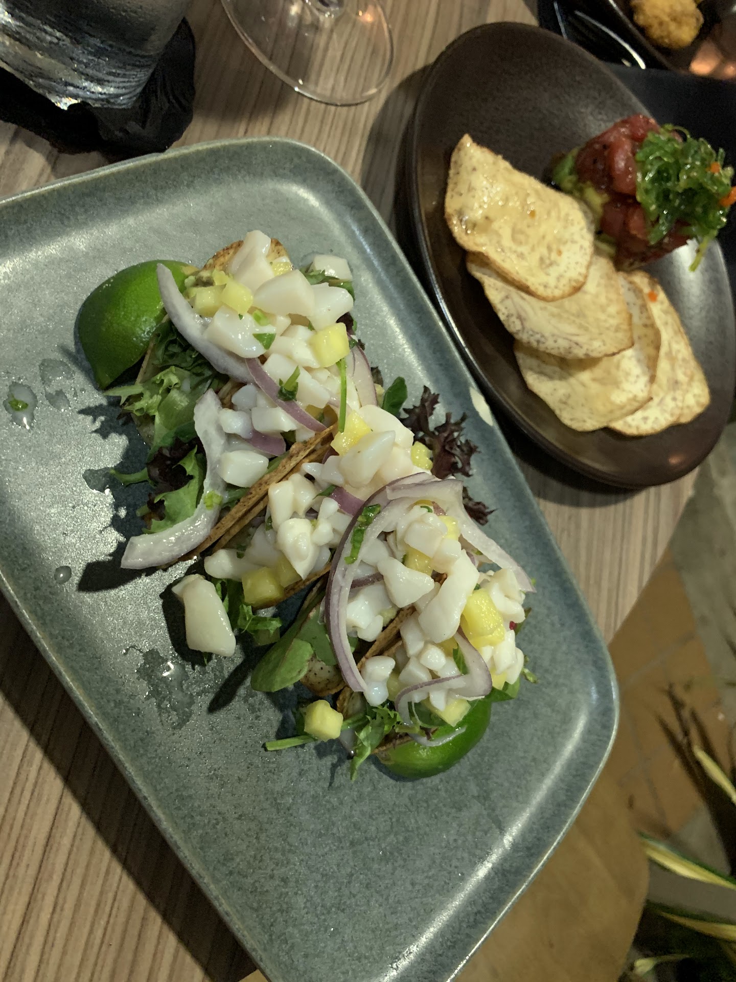 Two of us were seated on Sunday evening before 6pm. The left side of the restaurant had a few tables seated, we were seated to the right with no others seated over there yet. Our server was prompt to arrive with water and a small table for our handbag which was a pleasant surprise, the host's "my pleasure" was also very nice. Our server was very nice and presented a friendly smile. The ceviche tacos were great and plenty to share as they came with 5 street style tacos. When our appetizer was arriving there were 3 other tables seated nearby. The seared tuna for dinner was cooked perfectly as described and presented very nicely. The saltimboca on the other hand was neither, as it arrived as 1 piece of overcooked chicken with a slice of prosciutto, basil and melted cheese and not the veal dish I thought would arrive. As we were waiting for dinner to arrive, others around us including another couple and family of 3 had been seated, served and finsihed eating dinner, the couple had even left as we were still waiting for ours to arrive. As we waited another 10 minutes after receiving a small box for our togo was brought to pay, we questioned if we did something wrong to receive poor or subpar service than the rest of the restaurant. Atmosphere was the most...