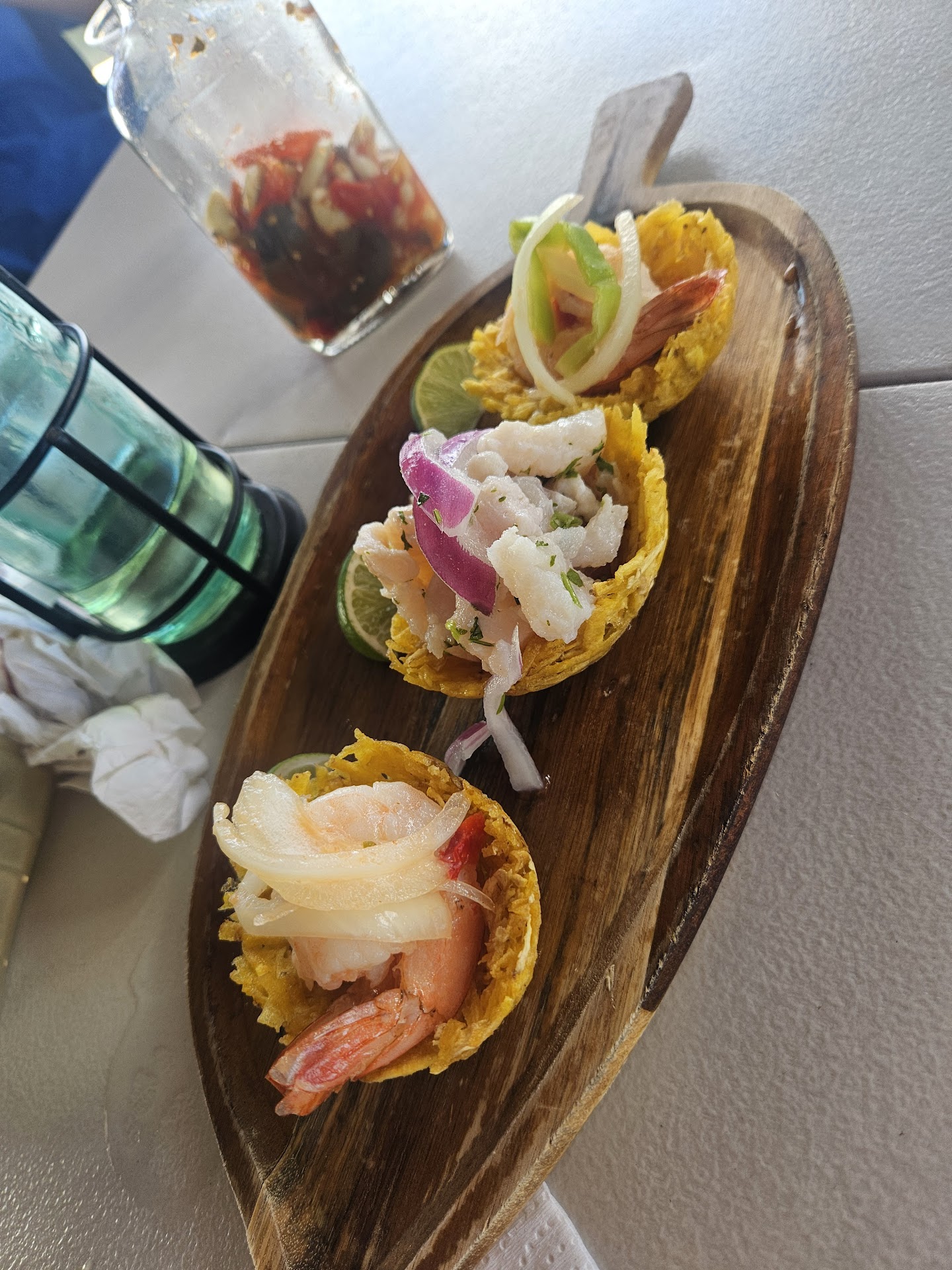Read moreGreat food despite super casual beach bar vibe. The 4 of us enjoyed Carrucho $15.00 AREPAS DE COCO $2.00 ARAĂOTA RELLENA Un Marisco $22.00 CEVICHE $0.00 FILETE DE DORADO $21.00 ARAĂOTA $0.00 LANGOSTA AJILLO $28.00 TOSTONES $0.00 MOF. RELLENO CAMARONES $23.00 AJILLO $0.00 everything was delicious but the stand out were the warm coconut arepas that we filled with carrucho (conch) as appetizers. The piña colada comes with whipped cream on top and the mojitos were bright and refreshing. The rest room was clean and convenient (nicer than youâd expect from the dining room vibe). Iâd highly recommend everything we had but donât...
