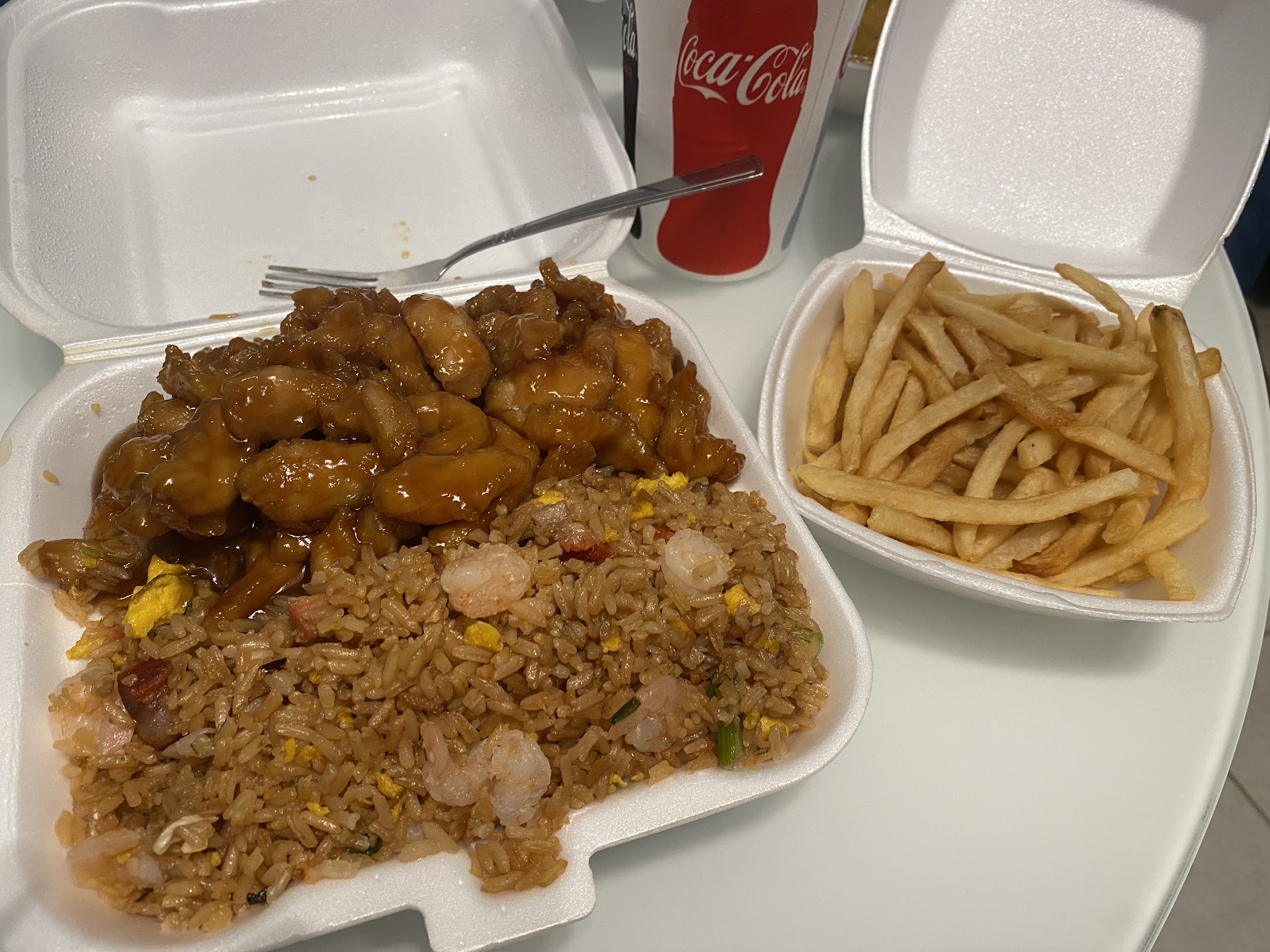 The portions were overwhelming. I ordered the orange chicken and could tell it was made with real chicken. It was good but so much that I could not finish. My food came with pork fried rice and an egg roll but I was surprised with the French fries thrown in the mix too.