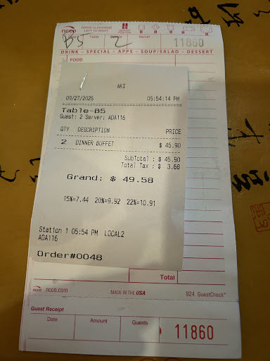 Read moreI was very disappointed on the quality of the food at this place, is below average, the restaurant is very clean and the buffet presentation is good, the only downside is that the food quality and ingredients is below average, the sushi is bland, lacks protein inside and it's super basic to be the worse I have ever tried. They charge very little for the lunch buffet but to be honest the cheap price is not worth the quality of the ingredients used. The hot stations are questionable, food looks stale and unappealing. The service is average here, not bad just average, the atmosphere is also unappealing and they are in need of a new look. I have been coming here for years because they are close to my work place and works for a quick bite, but lately their food has degraded in quality to the point to make me decide not to come back here and write this review, is understandable that now a days everything cost more, but trying to cut cost in an already low quality menu had been disastrous for this place. I would not be...