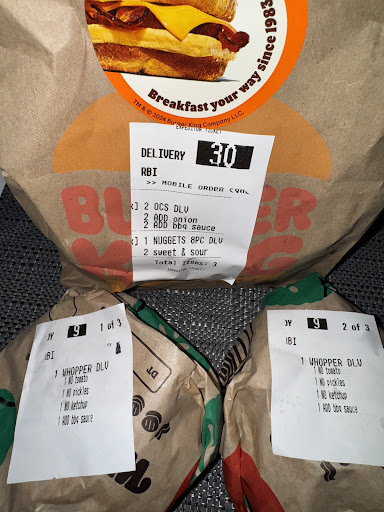 I placed a third order, warning the driver of what they would be doing, and loā and behold, I actually got something delivered. I had ordered 2 Original Chicken Sandwiches and my 8 PC chicken nuggets because after 11:00 looks like, the promotion for the BOGO Whoppers no longer applies and the prices went up for the Whoppers either way.