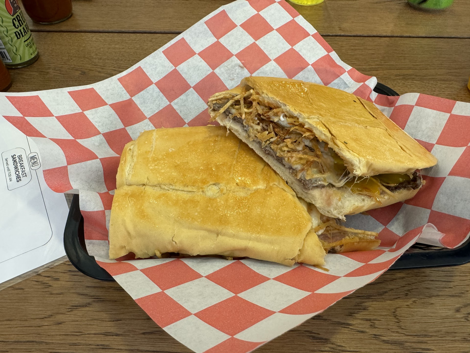 As for the food, all the sandwiches are themed after figures or places of Spanish/Latin legend or myth. I ordered the “El Cid”, which is their take on a pan con bistec. Off the bat, this steak sandwich is superior to every other I’ve ever had based on its tenderness alone. So many steak sandwiches in Miami have this rubbery chewy texture, where you end up pulling the whole steak out from under the bread. Not with El Cid. The meat gives way easily, and the flavor is explosive. The sandwich is also huge and I’m a big guy and even I struggled to finish it. I washed it down with a Jarrito that I got from the pick up fridge. In there were other beverages like bottled water, as well as some house squeezed fresh juices.