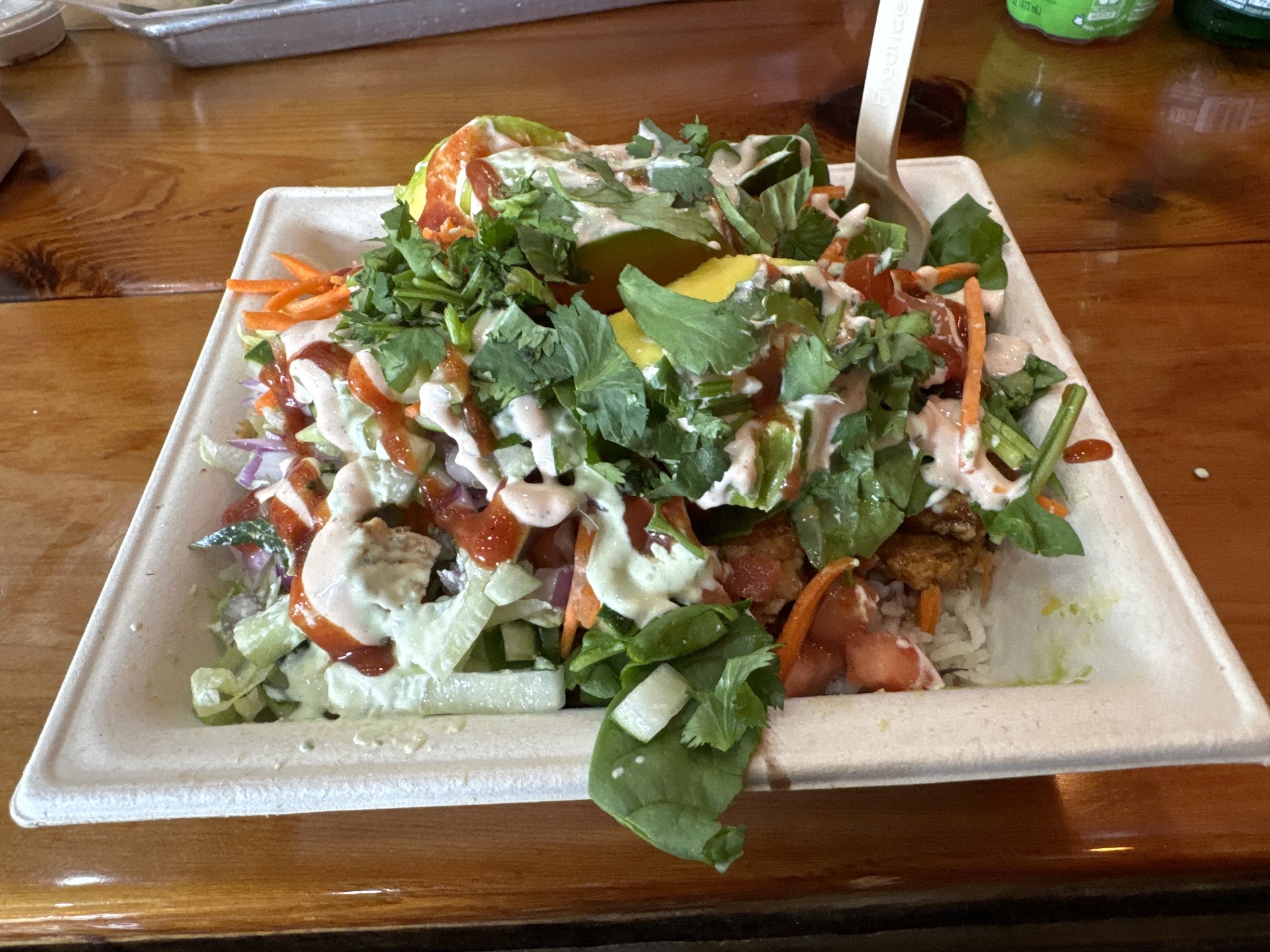 My choices for the bowl were brown rice, chili chicken, chickpeas, lettuces, tomatoes, onions, cucumber, cilantro, topped with the garlic cilantro sauce. It was very tasty! Definitely a great place and would visit again if I’m...