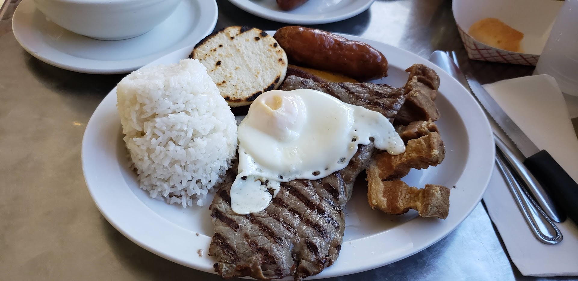 I recently had the full breakfast, which includes scrambled eggs, steak, rice & beans, and arepa con queso. Is that a lot of food? Absolutely. Even my large appetite couldn't handle the last few bites... Is quantity served over quality? Absolutely not. I was pleasantly surprised at the quality of the steak. It's too often that a restaurant will skimp on this aspect to cut costs. And the eggs! Scrambled to my preference! Not too soggy (some people like their scrambled eggs wet, not me) yet not dry.
