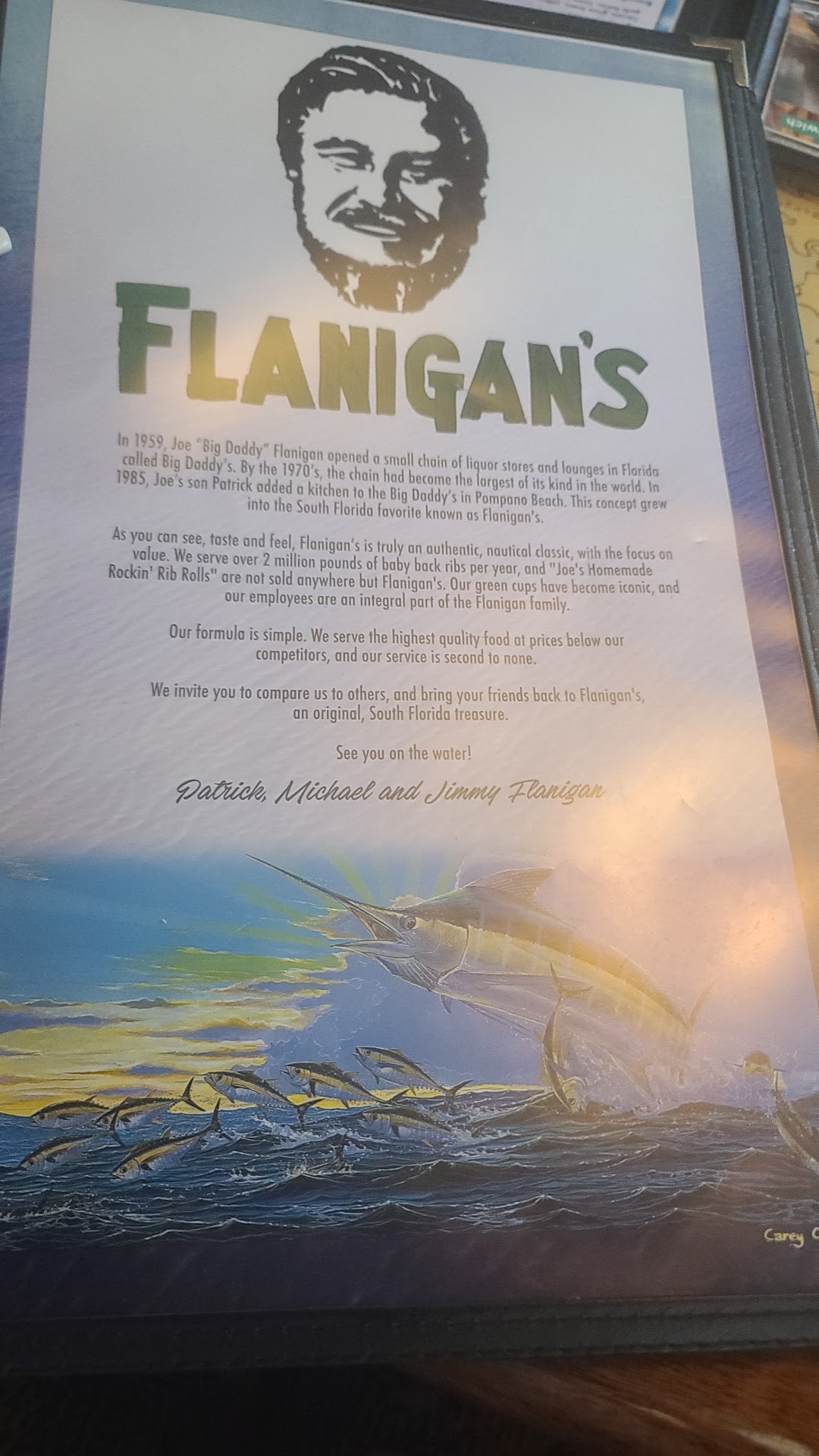 Read moreLet's just start off by saying that i love Flanigan's.. every one that I've ever been to, and that's most of them. The experience was always great.. until now. It was a Wednesday night, and like most nights, the place was packed. We only had to wait about 10 minutes to get seated, and now i know why. We were seated in a dining room full of very loud, swearing drunks that were apparently having " a party". It was ridiculously loud, to the point that we couldn't have any kind of a conversation at our table without shouting. The two couples behind us were having the same problem and were also upset. We called our server over and asked her how this was acceptable, and she agreed with us. She said she couldn't take customer's orders because of the loud yelling. We observed a group of eight being seated in the back of the room, and after a few minutes of this abuse, they got up and left. Another family with a young child, maybe 3 years old, had to get up and leave before they finished their meal because the child was crying non- stop, i would suspect because of the very loud yelling. Our server asked if we would like to speak to a manager, to which i said yes. After about 10 minutes the manager finally showed up, and asked what our problem was . OUR problem? I asked him if he thought the yelling and swearing was acceptable, and he said that he didn't notice that it was excessively loud! Are you kidding me !!!! We could barely have a conversation with him without yelling. This manager didn't seem to give a darn about how we felt, or that his server was also upset about the inappropriate behavior, or that 8 people walked out rather than subject themselves to this abuse. Very, very unbecoming of a restaurant manager, especially a manager for such a customer service friendly company like Flanigan's. Needless to say, with other Flanigan's options available, we will not be patronizing this restaurant again. I doubt this manager will...