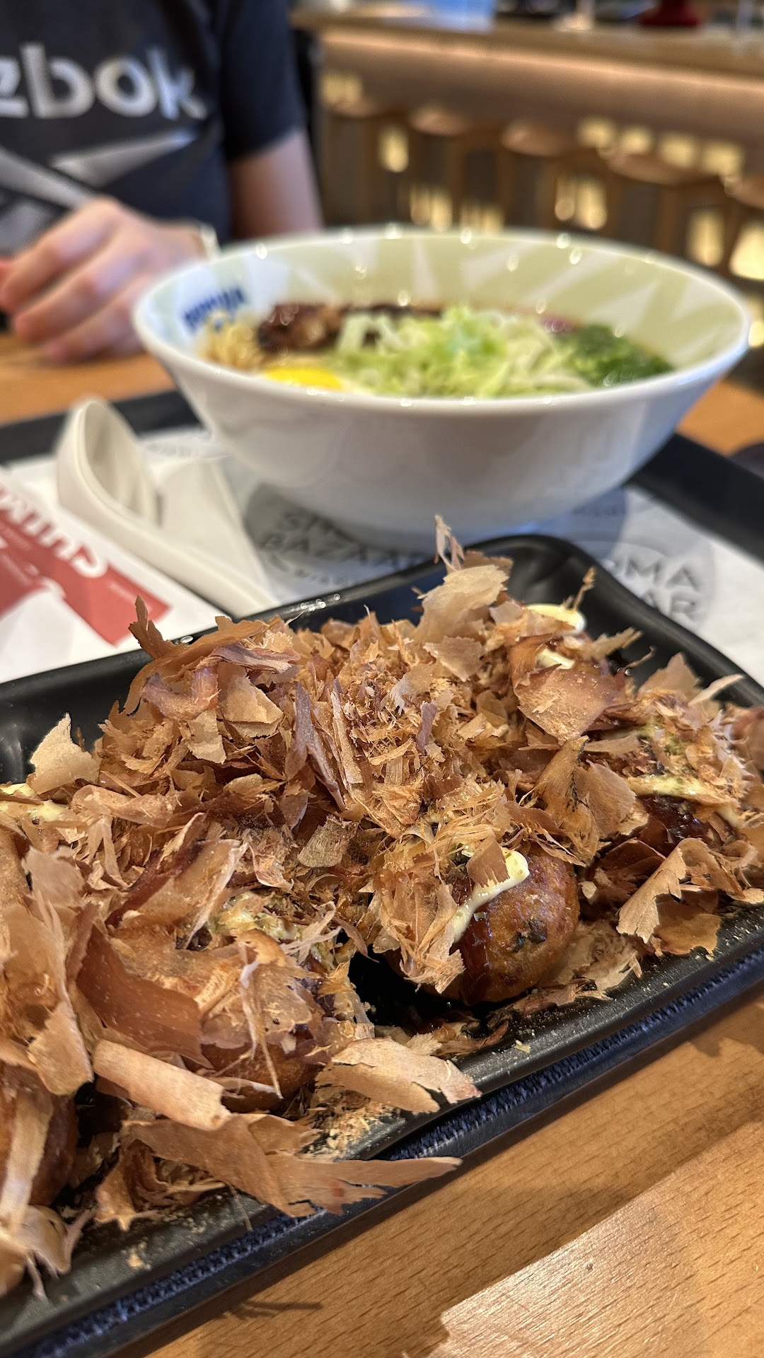Read moreThis is a food stall in the Bazaar food hall, and such everything you buy has a premium added to it. They charge $20 (pre-tax and tip)for the spicy tonkatsu ramen (forefront in the picture). It came with ONE very thin, almost deli style, slice of "chasu". It only brought half an egg, which was hard boiled and not marinated. I asked for no mushroom but the soup, as you can see, come very plain. In the background of the picture, you can see the "large" bowl, which is not a larger bowl but same size with more fixings, a whole hard boiled egg, and a couple more slices...