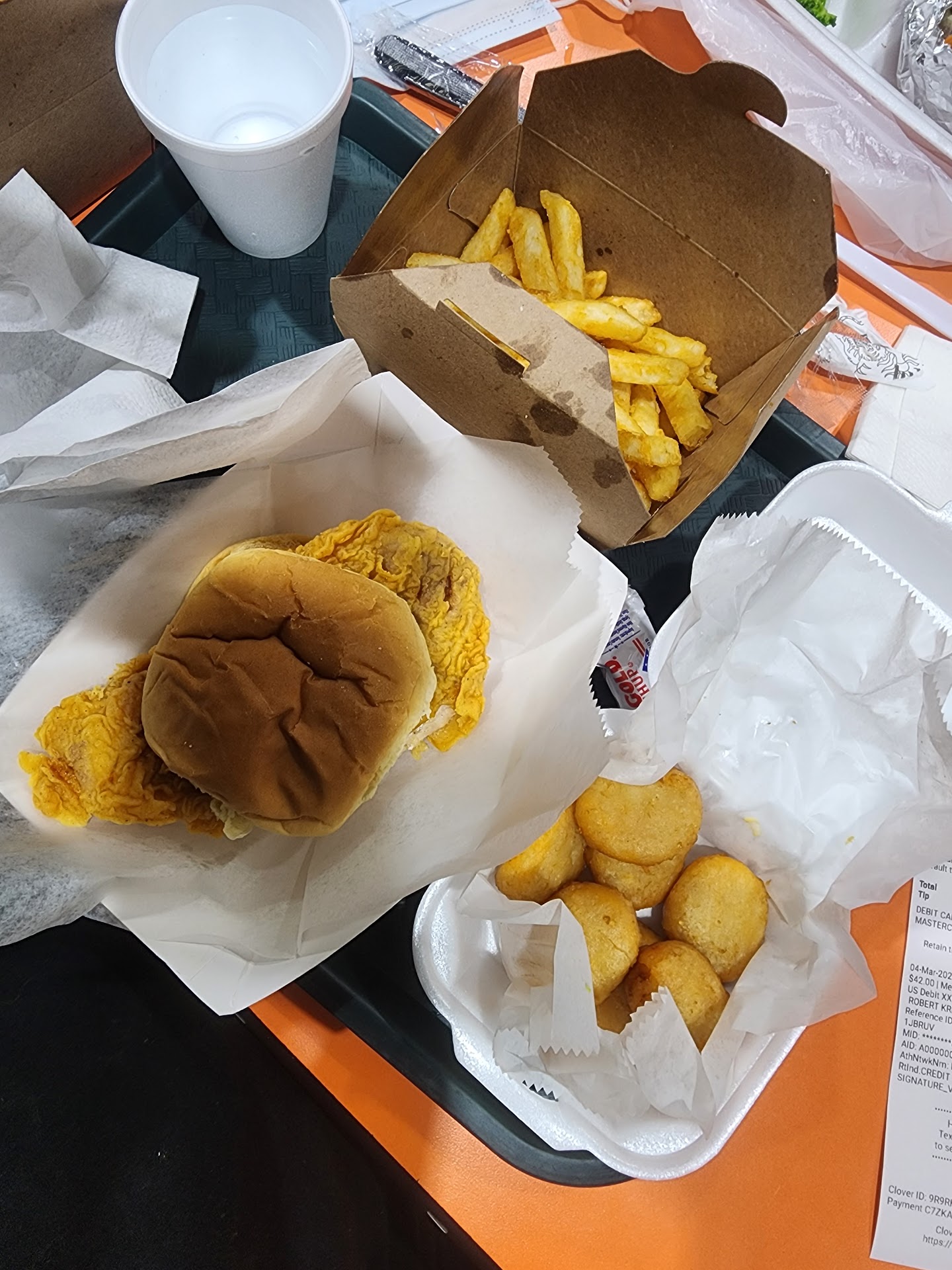 I Also got the fries, mac n cheese bites, the hush puppies and the cup chicken. The fries were super crispy without being hard. Super good. The Mac n cheese bites were also very tasty. You Also get a lot of them! The hush puppies had a great corn flavor to Them and were a great compliment to my chicken sandwich!