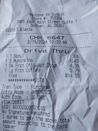 Read moreDunkin' let me tell y’all about the team at 1865 E. Main St. Dothan😍 This team is always the most friendly and helpful I have ever experienced at Dunkin’💯 & I have visited them from Panama City Beach to Tallahassee, to Birmingham to Gainesville & no other compares to my home store!🤞🏼As an Emt I’m on the go with 911 ALL day & believe me we are blazing the roads all day to and from the hospital. & I know if I need a pick me up I will only stop at this location. They know how to get my coffee fix prompt and exactly how I like it. 90% of the time they see me pull up on the ambulance and they already have my order going before I make it in the store! I know they have to be tired of seeing me but they always greet me with a smile on their faces! I couldn’t ask for better service and great personalities! It’s the “Be safe out there today.” For me! 🥲 Y’all are just as essential as I am and I thank y’all for your service! & keep being great!☺️