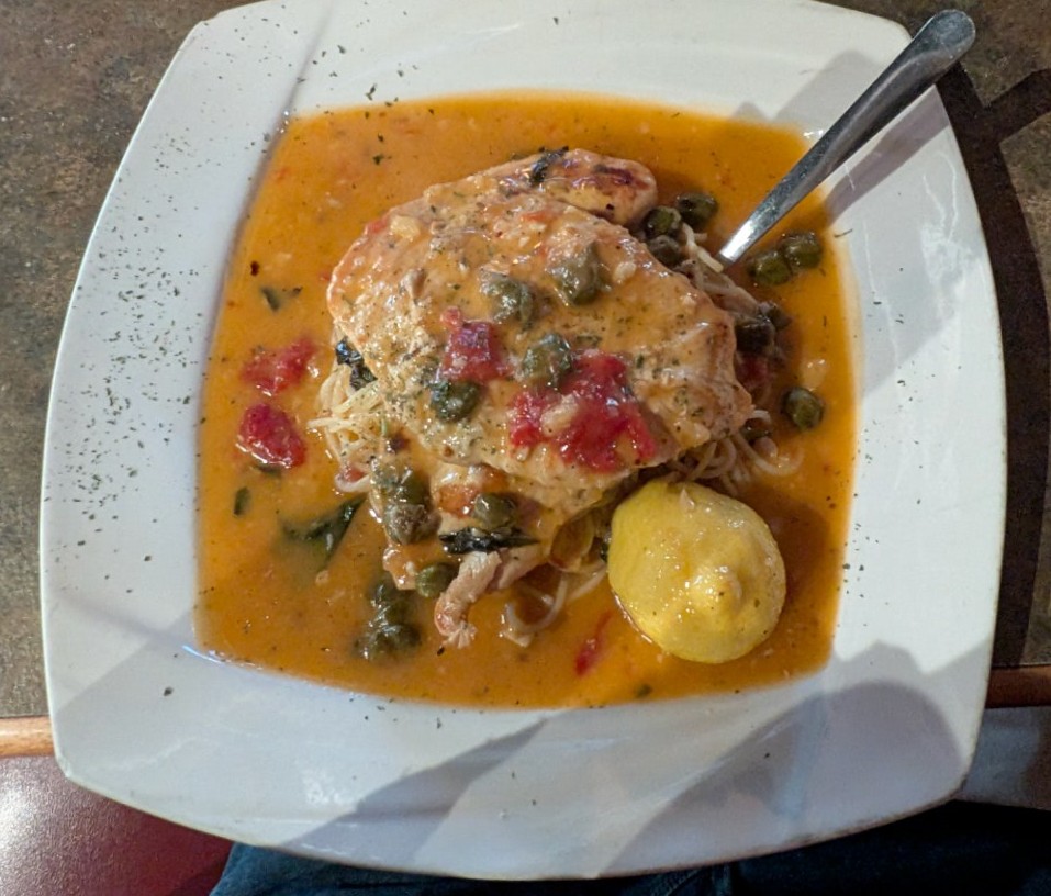 I ordered the chicken piccata. Melissa ordered the shrimp tortellini. Both were so bad we sent them back. My chicken was chewy and gamey, and the pasta was rubbery and bland. Her shrimp still had the tails on, and the sauce had the look and taste of a microwaved seafood TV dinner—thick, oily, and flavorless.