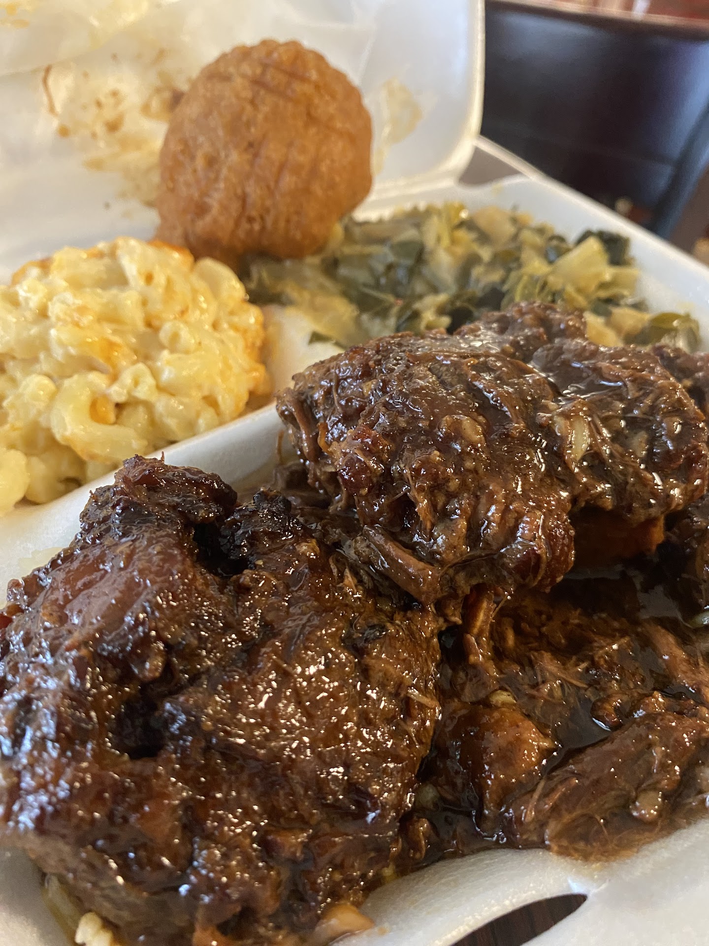 The food was absolutely delicious. The food was served cafeteria style. Mostly everyone ordered a meat and two sides. Personally, I ordered the oxtails, macaroni and cheese, the collard greens/cabbage mix and a side a chitterlings. The oxtails were hearty and tender. Then the sides were just as amazing in taste. I didnāt know what to expect from the collard greens/cabbage mix but I thoroughly enjoyed it.