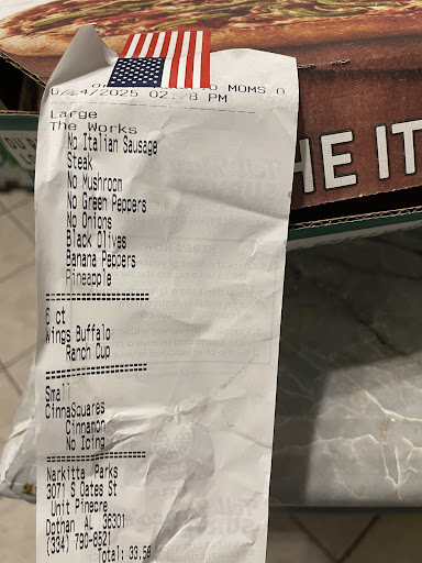 Read moreI wish so bad when I order pizza at my job and can’t leave because I work in the medical field that the other location on Ross Clark could bring my orders because every time I order here it’s a problem normally I don’t say anything but guess what my receipt said no mushrooms on purpose (I ordered the works pizza) but I got mushrooms and I’m allergic it was suppose to have bacon but no bacon! So basically I paid almost 40.00 with tip that’s not shown because my delivery driver did not give me one so I just used the pizza box receipt to only eat cinnamon bread because I don’t like wings I just ordered them for my coworkers! I’m pissed 😡 I hope corporate see this! I have been ordering for years in different places not just this state or city but this location always...