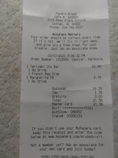 Read moreI would give zero stars if I could. I placed a mobile order that my husband picked up for me. Once he got back home, I was missing half of my order. I called to let them know that my husband would be back, and they said they would have it ready. Keep in mind, traffic was crazy, it was freezing and raining, so it was not just an easy drive to get there again. Once at the window, my husband said the employees spoke very nasty to him and were extremely rude after he stated “my wife called to let you know I would be back and yall said you would have it ready” and the employee stated “well what do you want me to do about that?” Once he got to the window, he stated that there were 3 employees that seemed extremely mad with him. How can you be mad over your mistake and ripping someone off? Do your job. It’s not that difficult to put food in a bag and do it correctly. They’ve lost my business for good!!!!! And I eat Panera...