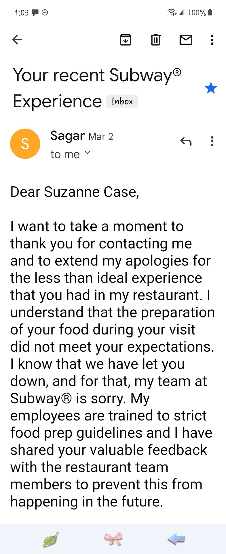 Around March 1st I went to your establishment In the Walmart to get sandwiches for my sons birthday I got my order when i started eating mine i realize that the sandwiches was not made right it was missing a meat I called to complain and the woman who answered the phone say the phone said to just bring it up there I sat there and told her I live 20 minutes or so away and she said what do you want me to do About it so basically my sandwiches was wrong I wasted my money I get the owner to email me the next day to promise me something to mail to mail and I gave my email address gave my address and still have yet to get anything from the owner I would never walk into that restaurant ever again one They have employees that are rude to their customers too . you have an owner promising something and not sending it They have employees that I would just want to inform people that I highly doubt they care about their customers if you have employees who talk to their customers the way the way they did so I'm writing this this complaint because Your restaurant owners don't care about your customers and whether the food was right or wrong your employee think that they can talk to your customers a certain way and think it's OK well it's not OK I will complain on every single site about what my experience at...