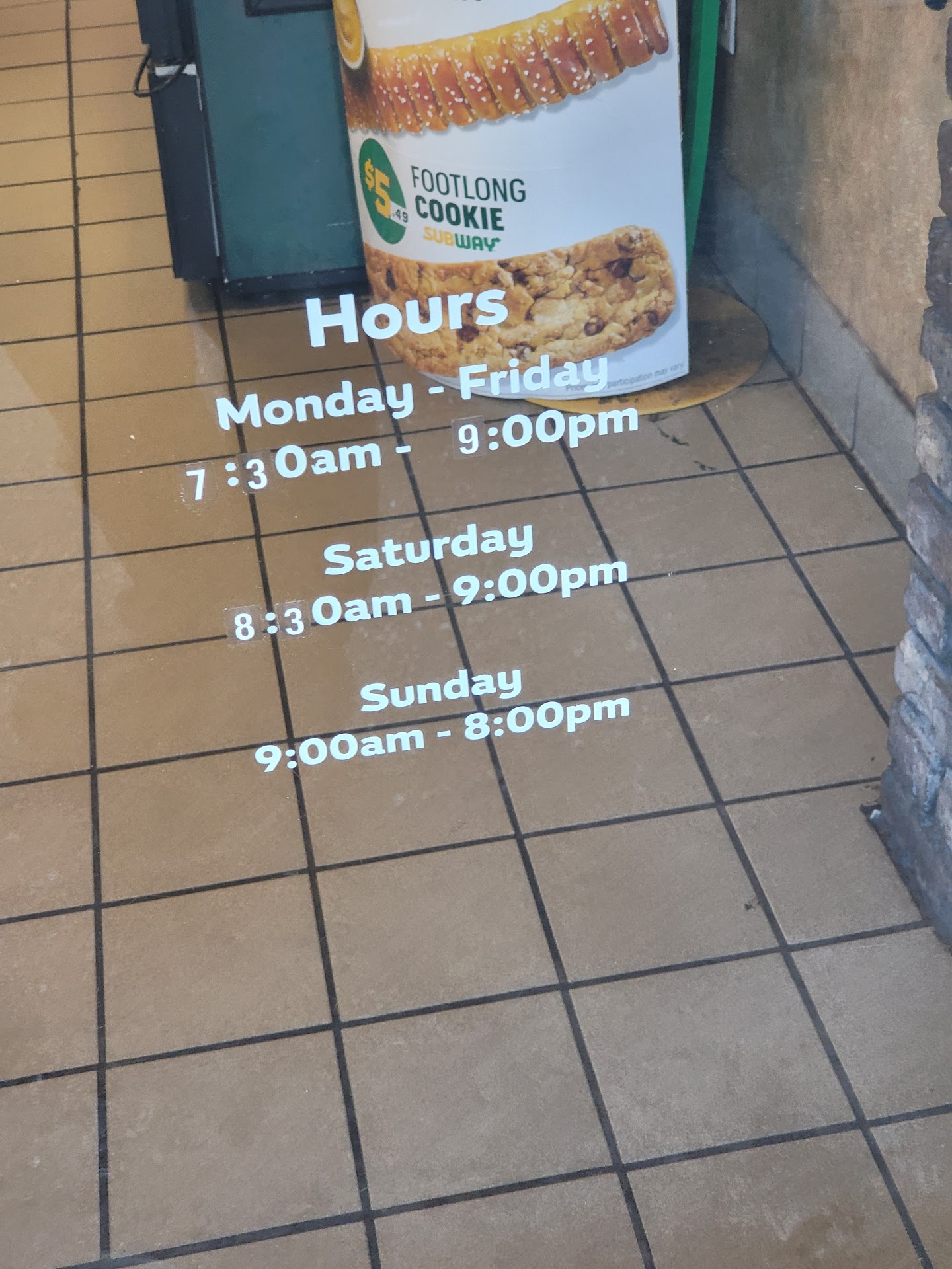 Read moreI came in about 7:25 pm for a meatball sub and they close at 9, as soon as it was my turn to order she ask me what bread I wanted, then by the time she was cutting the bread halfway she says she had already put up the meatballs. You close in an hour and a half and you already put it up is poor customer service don't take on any job if your not going to follow protocol. I went to another subway and they told me that this subway had way too many complaints doesn't surprise me. Won't come here again until they have people who can do their...
