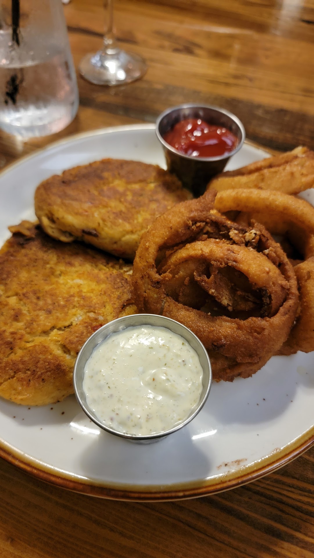 Let's start with the food. It's not bad, but it's fairly pricey for what it was. I got the ribeye steak, medium rare. My wife got crab cakes. Both the steak and the crab cakes were very good! Especially the crab cakes, the steak was good, but I expected more flavor and maybe a thicker cut than what I got, but again, not bad, it was pretty good. They probably were the sides, I got roasted vegetables and french fries. The fries were delious as you would expect. But the "roasted vegetables" weren't really roasted, more like warmed. It was weird, and the flavor of them was just bland. When I saw roasted vegetables, I was expecting something with a light char to them, not burnt but a little crunch. That was not the case here. My wife got onion rings, and oddly enough, they were below par. The breading wasn't flavorful, just kind of bland.