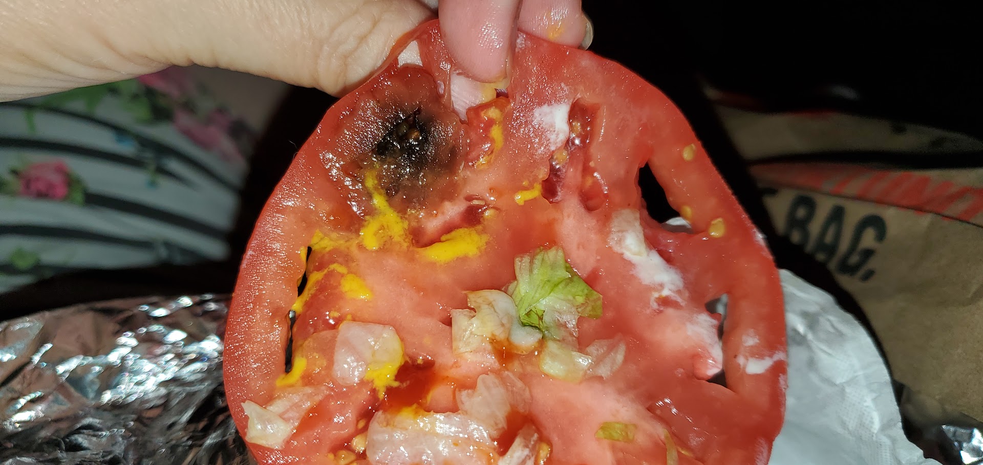 The quality of the ingredients see the three images of the slice of tomato with a black spot that's not acceptable and frankly the person that put the sandwich together obviously needs glasses and a remedial course in the anatomy of what constitutes a consumable...