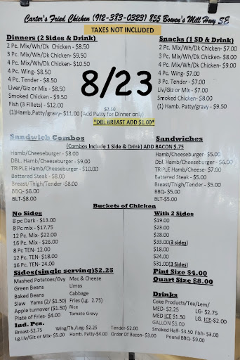 I absolutely love this place. The chicken is top-notch you get a good amount of food for a very good price. The customer service is exquisite I used to go to the other one and only went there because the food was good and I thought their chicken was good until I tried this Carters and this one blew it the other Carters out of the park plus they have good customer service they're not on their cell phones they're not rude they don't smack their lips at you and then I'll say huh and what while taking your order in the middle of their text messages which is Major brownie points in my book. They also have smoked chicken which is finger licking good and the owner has always been nothing but nice and speaks every time I walk in. If a customer has an issue it is solved without hesitation or back talk. You never have to worry about not getting enough for your buck @Tidwells Carter's chicken. So if you're not from Douglas and you're going to be near Douglas or coming through Douglas I would always stop in and get you a fried chicken or smoked chicken plate with okra because it tastes homemade and hand battered I think it might be I honestly but it is so good so it's sweet tea and that's all...