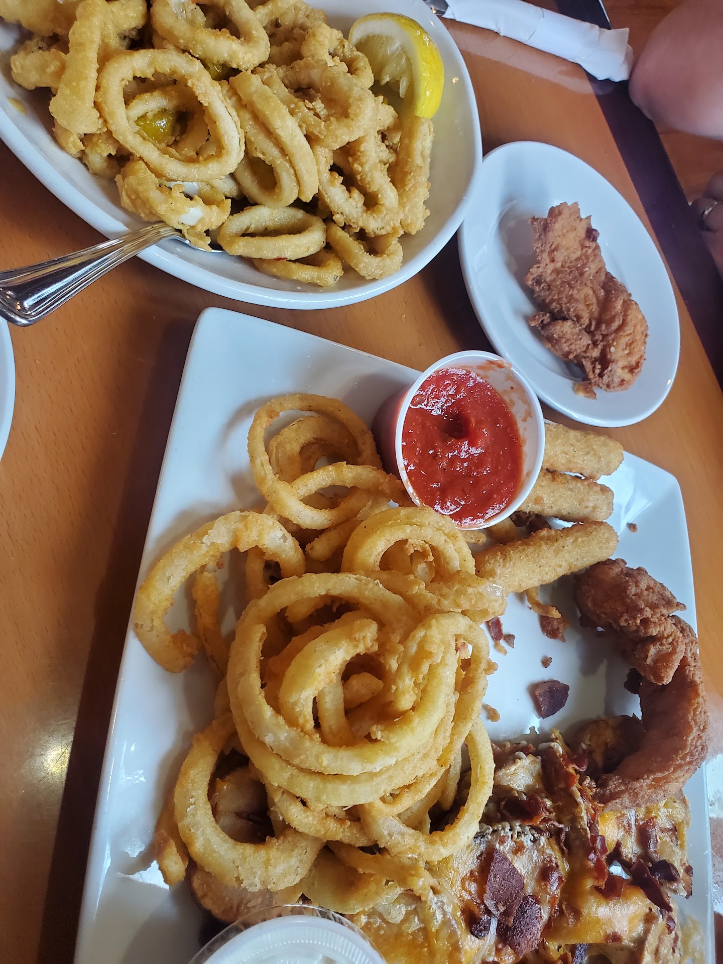Read moreLoved this place. It's small and quaint but don't let that fool you when it comes to their food. Delicious, beautiful portions and amazing service! Can't wait to go back! The calamari in the butter garlic sauce was exquisite! Not overly sauced and still had a good crunch to the coating. You can definitely taste that it was fresh, not frozen! The onion rings were heaven and were also freshly made. The sampler and the chicken tenders were amazing! These two apps alone were enough for dinner for two! We then ordered our entrees. Him, NY strip blue and me, steak tips with demi glaze med rare. His steak was exactly how he wanted it, and still had beautiful grill coloring and my steak tips weren't overly powered with the sauce, yet the tips were so tender and I still got hints of sauce and steak taste. Because our apps were so large, I ended up having to take my entree home in a to go box. For my drink, I ordered the fish bowl for one. Loved the Swedish fish in the drink and it was delicious!