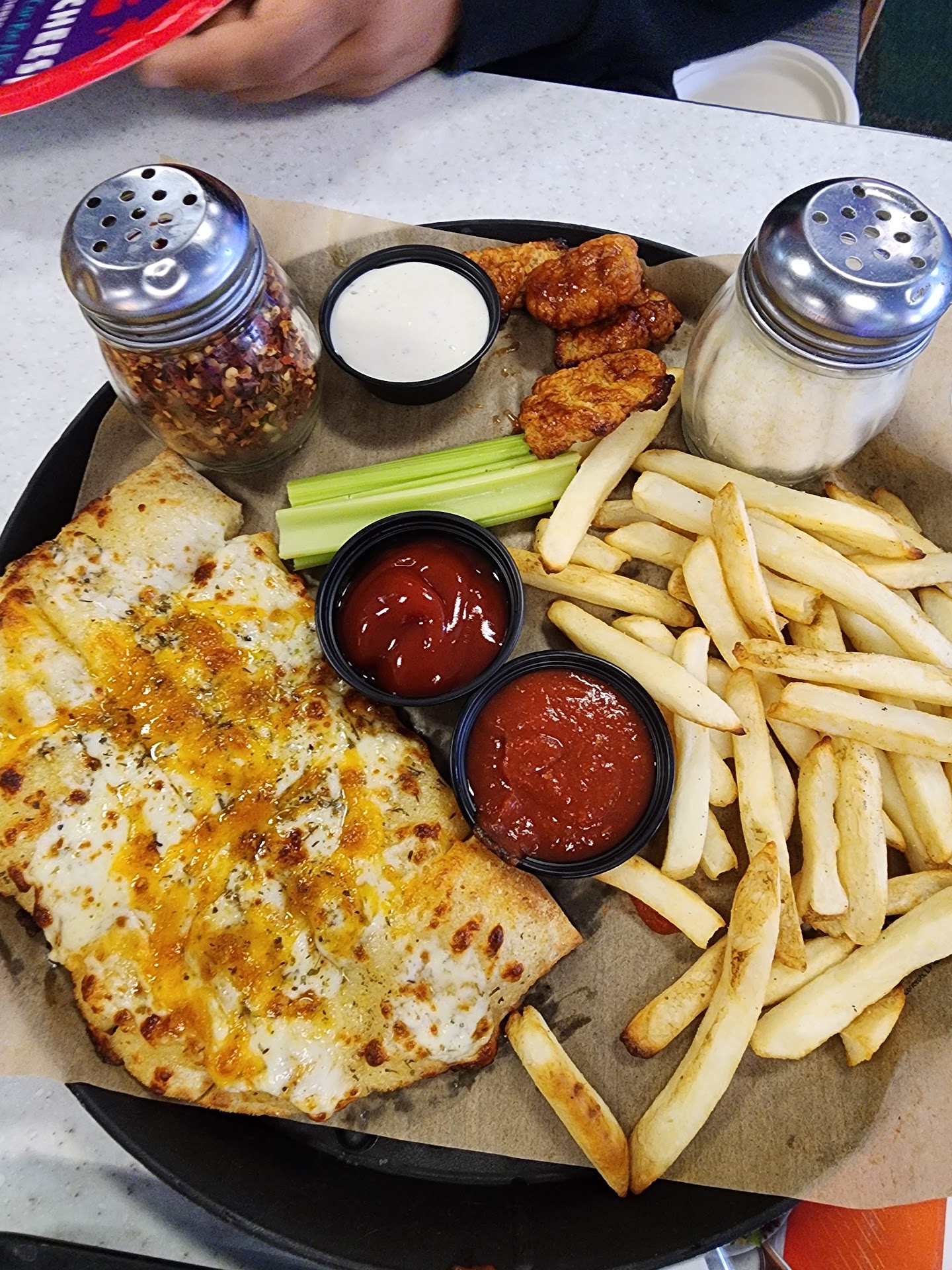 Read moreParty of 8. 4 children. Initial impression walking in: it looks and smells clean. My kids had the same experience with games you expect at a chuckee cheese. Although our family visiting from out of state said it seemed like there were less games than they were used to seeing in other chuckee cheeses and I agree it seemed like they had less than we typically experience but it wasn't a huge deal. The problems were all around the very expensive food. We always get food when we go to any chuckee cheese location. We NEVER have problems. At this location our pizza was a touch shy of being fully cooked. We paid for a family upgrade but it didn't really appear much bigger if at all than a regular large pizza. The app sampler was the biggest problem. A tiny cheesy bread. Soggy under cooked fries. And 3 pieces of small chicken nuggets (boneless wings) and 1 crusty breading chunk that had no chicken in it. Not only were there only 3 actual pieces of (surprisingly small) chicken but we were told there would be at least 5-6. Then a member of our party who wanted wings asked about the $17 wings on the menu and was told there's only 5-6 wings in an order. We were BAFFLED. We came to this location because 2 kids had birthdays and it was part of their celebration. This location was close so we gave it a try. Over all I would NOT recommend this location if youre lookingnto eat. ONLY if the kids are playing games. If you want to do food at all definitely try a different location or go somewhere else altogether. It was a huge waste of money and a few people left feeling sick after eating too. Pictured is the sampler tray as we...