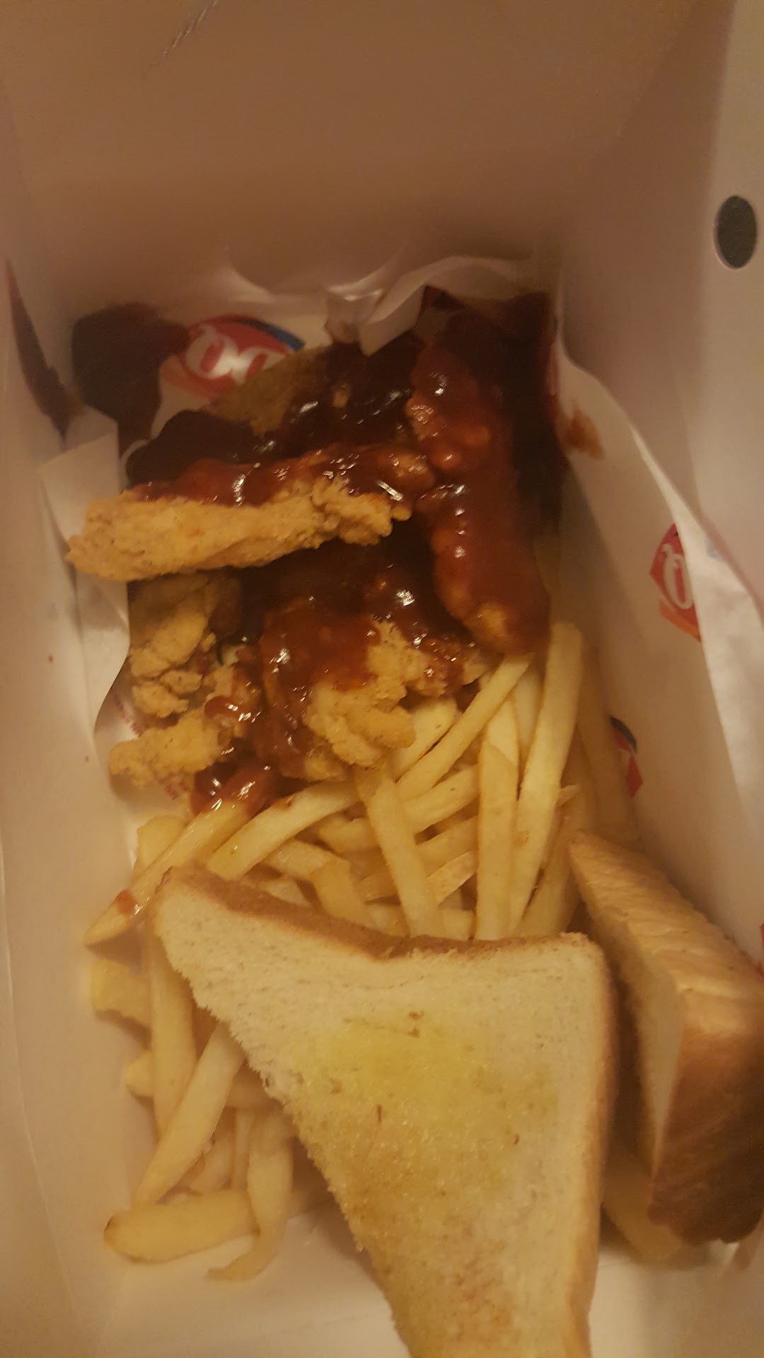 Oh boy... Seems all I'm giving lately, is 3* and lower! Sorrrrry! But, the truth, is the truth! So, I pull up at the Dairy Queen, drive thru. Not another car in sight! Yet it takes a person a good 5 minutes to come to the mic. Doesn't sound long, does it? Try solitting there for 5 minutes and see! 😉 So, FINALLY a guy comes to the mic. "CAN, I take your order?" (I don't know, can you? Of course I didn't say that.) Ok, I HATE...being "upsold!" So, I tell, every drive thru I go to....RIGHT UP FRONT..."I want a, X, Y & Z...and a 1, 2, 3...and THAT WILL BE ALL!!!" This day I asked for, "5 chicken tenders, ONLY! And, THAT WILL BE ALL!" He responds, "Anything else?" WTH?? Me: "Just chicken, thank you." HIM:"Would you like a drink with that?" WHAAAAAAAT? ME: "JUST THE CHICKEN!" HIM: "You wouldn't like a drink?" ARE YOU KIDDING ME??? Now, it's a war of wills! We BOTH KNOW what's going on here!!! ME: "JUST CHICKEN!" I didn't wait for another "drink question." I just pulled to the pay window! All I could think of was, "They're rubbing my tenders in their 'nether regions!' " OMG! And, it didn't help when I got to the window, the entire staff came from the back, looked directly at ME, for 2 seconds, then bolted back out of sight! Oh Lawwwerrrrddd! NOW I KNOW.....they're doing something to my poor little tenders...😭😭😭 But...when I finally got them, I began to CLOSELY examine them, for......well, stuff. 😉 That's when the manager who served them to me, said, "Please be careful, Sir....they are extremely HOT!" They were, too! So....I thought, "Well, at least the hot oil, killed whatever THEY put on them!" Maybe. But, if you travel much, and know fast food the way I do...a virtual "Cold Cut Combo Connoisseur," then, you KNOW when a fried item has sat there and gotten cold...and they REFRY them to try and "fake you out!" Huh-uh! Not this guy! All 5 of them..."refried tenders." ABSOLUTELY GROSS!!!! Don't get me wrong...I truly like DQ! But, this experience...was simply...